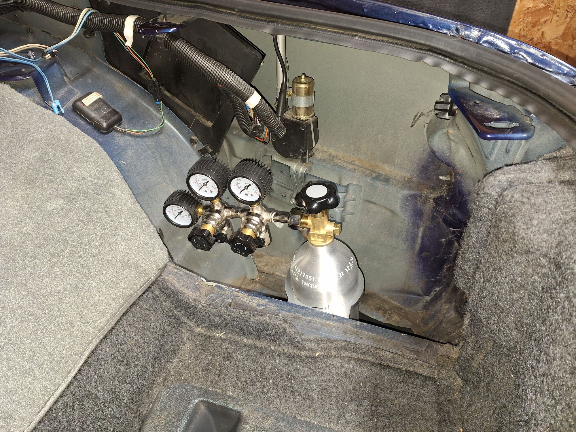 I also mounted my CO2 bottle in the spare tire well using some heavy duty foam at the base and an ICT Billet bottle bracket. Let me tell you, it was a royal pain in the *** getting the bolts into the bracket from under the car by myself.