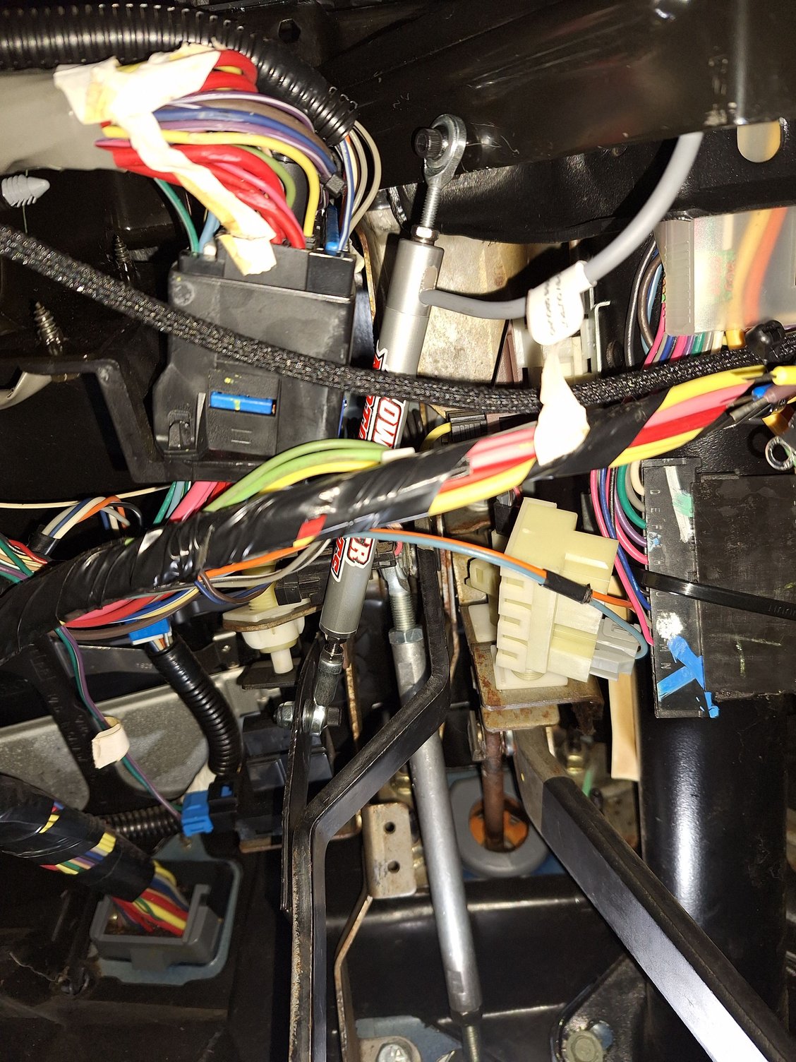 I did a fairly trick mod today, and figured others might like to do it if they have aftermarket EFI on their stick shift car. My 2013 Camaro has a clutch pedal position switch that tells the PCM where the clutch pedal is in it's travel, and Lingenfelter sells a box you can add to intercept that signal and tie it into their 2-Step box. I installed these on my Camaro and instantly my launches became way more consistent. It's one of my favorite mods on my SS, and I wanted to add it to my Firebird. I was contemplating how to mount a factory 5th Gen clutch pedal sensor and it seemed like it was going to take a lot of fab work. But then someone suggested I use a shock travel sensor, so I bought one with a 2" stroke and quickly figured out a way to mount it directly to the clutch pedal, with the stationary end being attached to the steering column support bracket. It took a bit of time to figure out exactly where to drill the holes so I'd have a full 2" of pedal travel. I ended up going slightly less than 2" because I know things flex down there and this sensor is mounted with nylon capscrews that will shear if the sensor gets overextended.