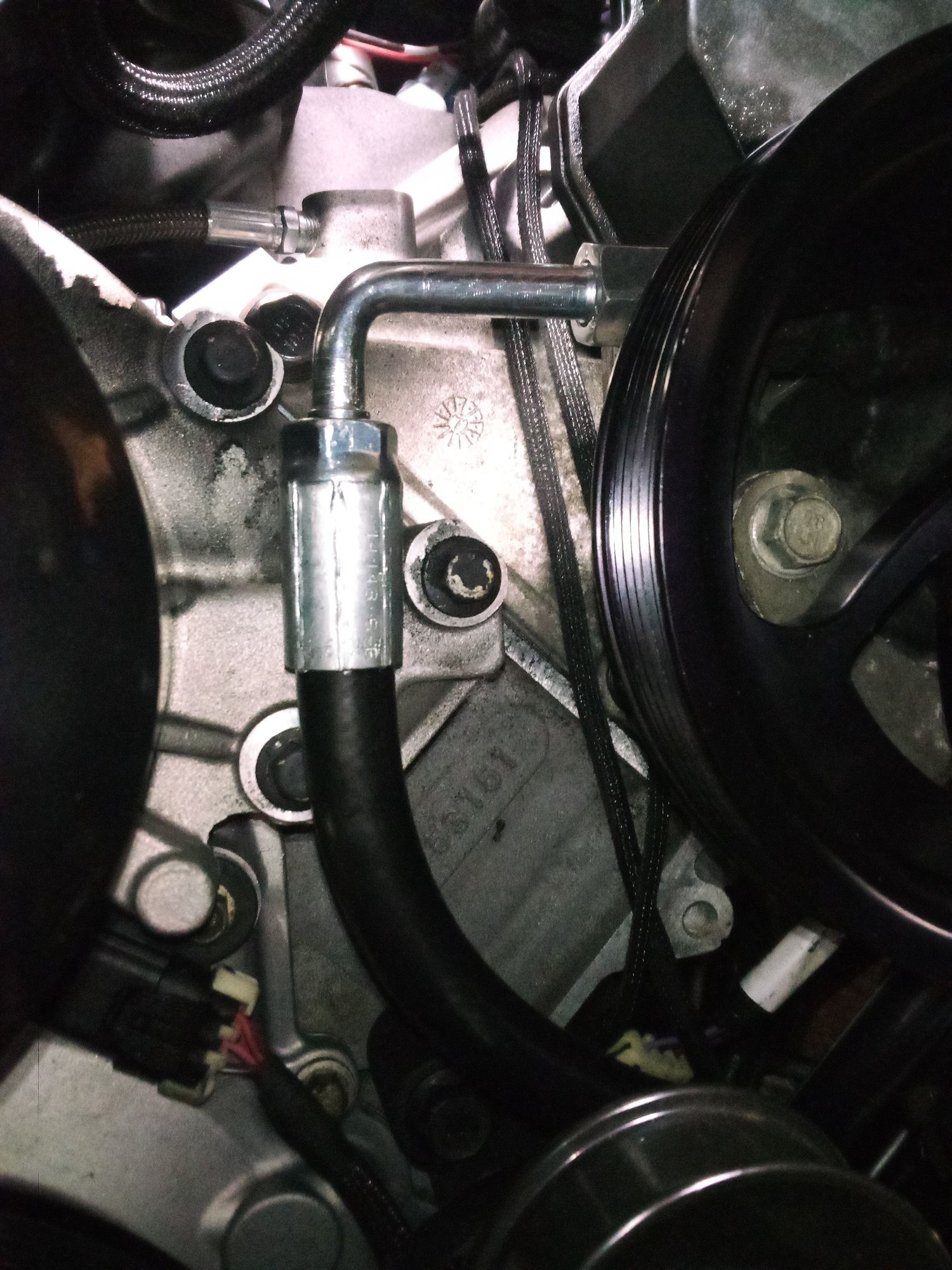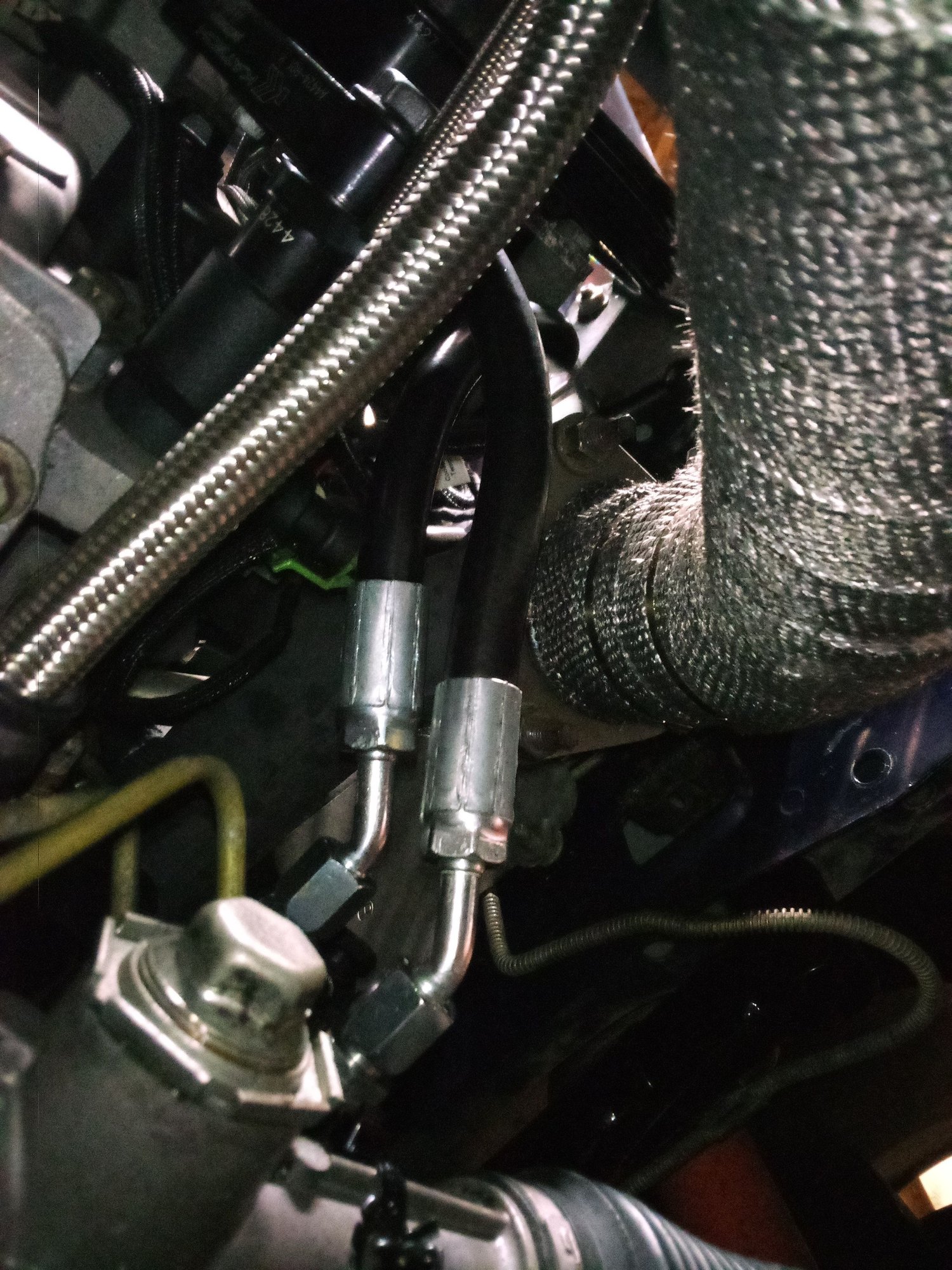Most recent mod, making custom power steering hoses since my stock ones started leaking after I bent them out of the way. I didn't like any of the pre-made aftermarket line kits, so I used the crimper at my work to build myself some nice ones that fully clear the Huronspeed crossover pipe. @The ****** Note the nice Turn One power steering pulley, lol.