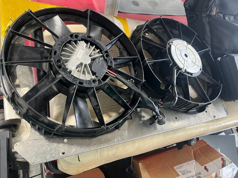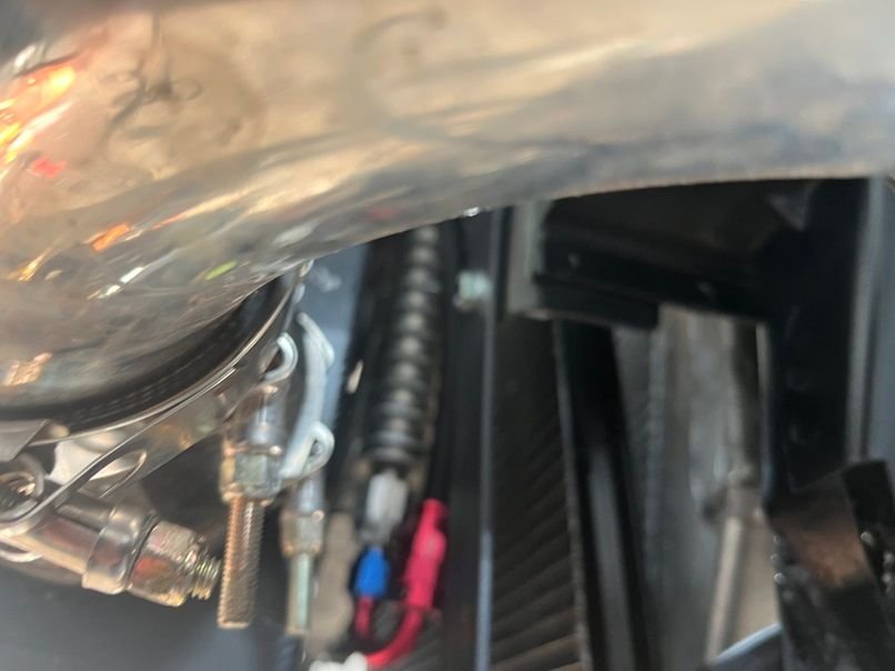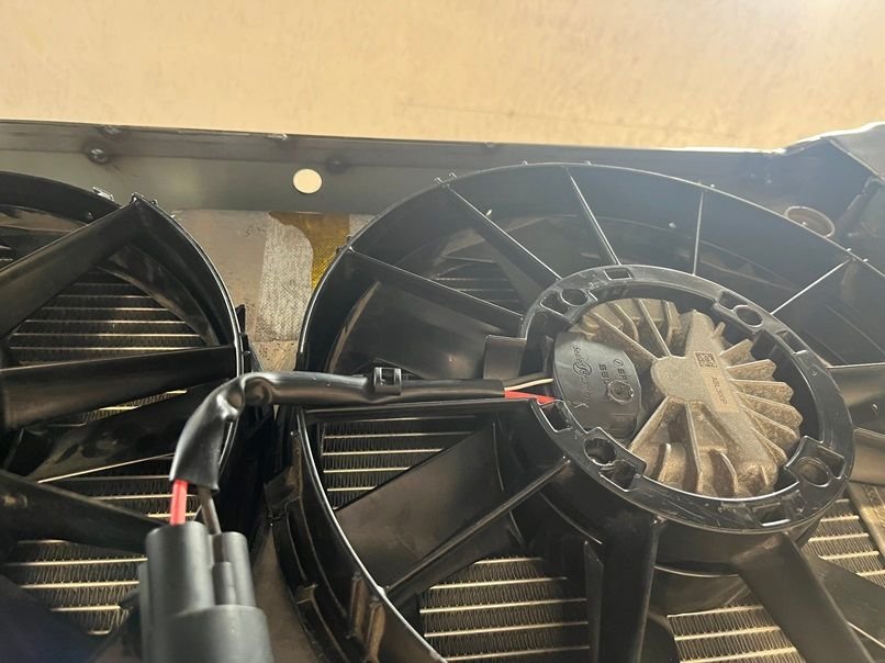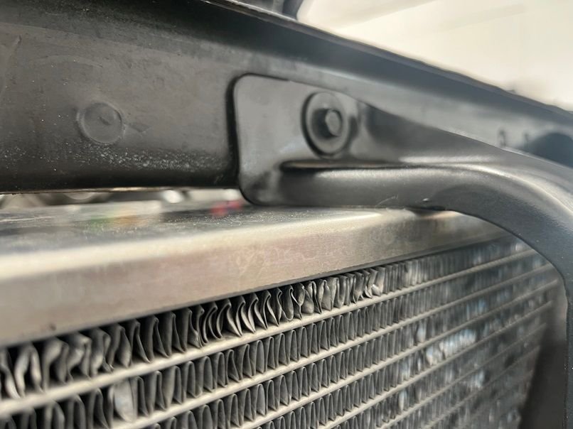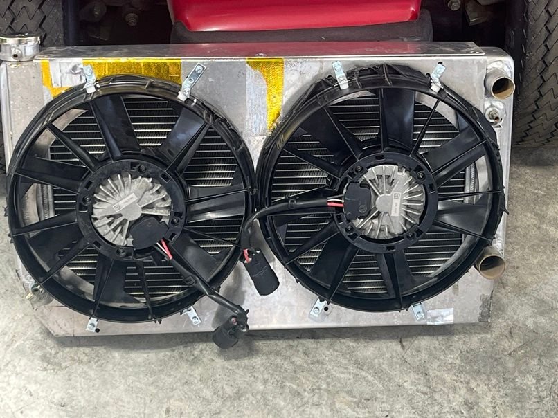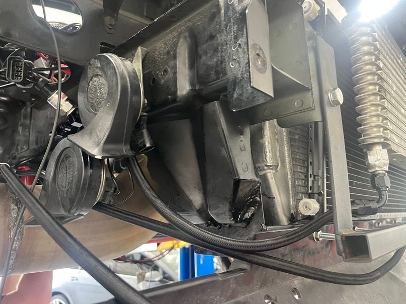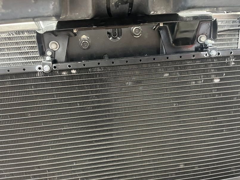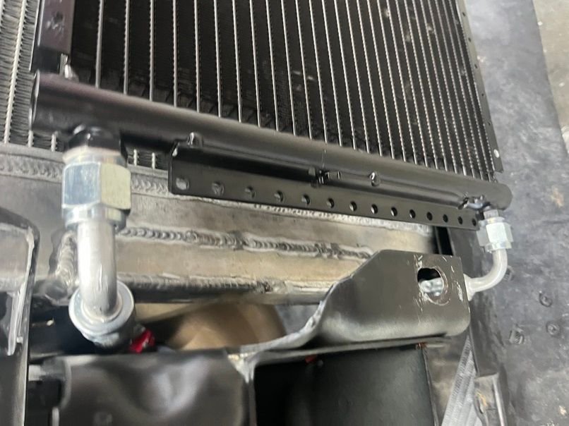 Next is the fan setup, fan shroud, and mounting of the Griffin 1-58241-XLS radiator. Fans are brushless 12” 2017 Chevy Volt pullers, 300w each. The shroud setup is temporary, as mounting the fans like this is going to result in the fan touching the turbo, which isn’t good. A new shroud with recessed fans is in the works for the near future. To get the needed clearance, the radiator needs to be pushed up as far forward as possible. Right up against the hood latch, since we are retaining the factory hood. The lower rad support needs to go, and a new one was fabricated that is 1.5” lower than stock. This will give the new rad enough room to be pushed forward. These fans pull some serious amps, so blue sea systems fuse holders are used. Cutting and trimming of the upper bumper support bracket is also needed to clearance the rad. I found that the huron speed front intercooler support was perfect for mounting of not only the 6” A2A intercooler, but the Truecool 40K transmission cooler as well. Behind the transcooler is a 12x24 condenser, which doesn’t mount up against the rad, but rather at an angle. For this reason, an upper fan shroud will be made so that the AC still blows cold while at idle.