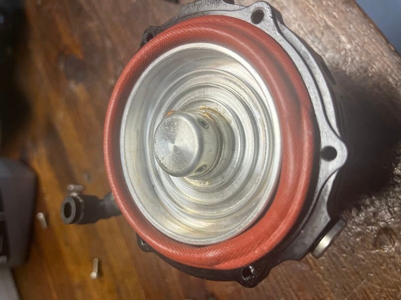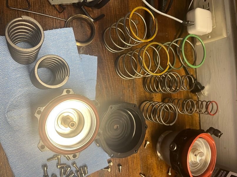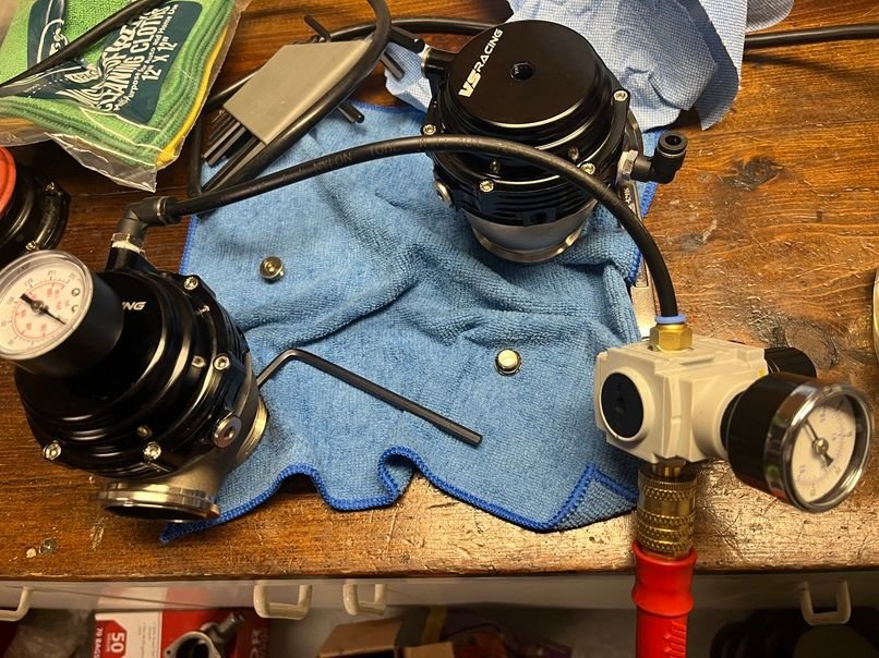 With these being used VS Racing wastegates and blow off valves, I wanted to completely disassemble them and inspect for leaks. I used Loctite on the piston set screws and did a pressure check for leaks. The rated spring pressure matched the actual measured pressures perfectly on both the gates and the bov. It didn’t help that the diaphragm was bent, so a new diaphragm was used. With no sign of leaks, the 11-13 PSI springs in the BOV and 10 PSI springs in the gates should be a good start.