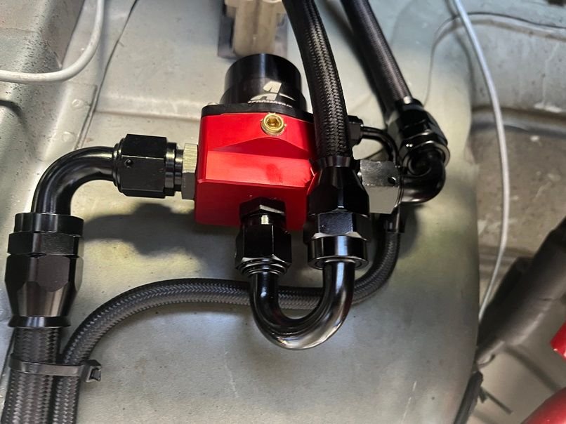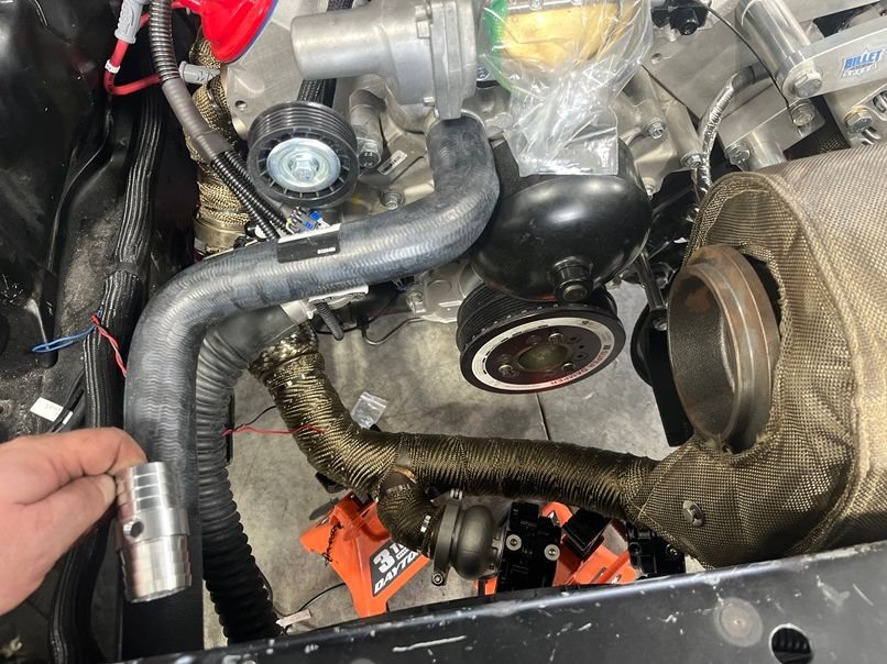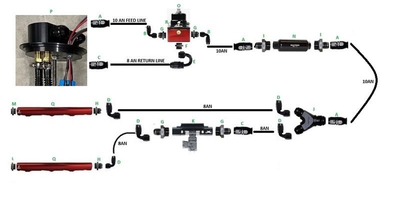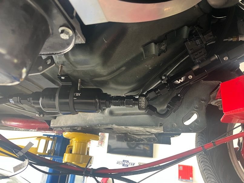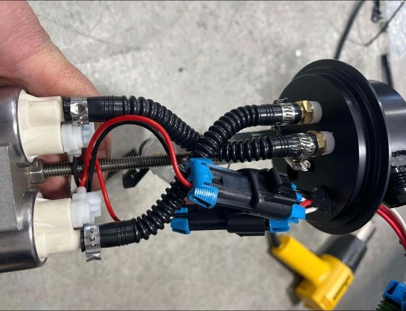 With all that out of the way, next came the fuel system. Throw in a few Hellcat Walbro 525 pumps with a CHRS1313 billet fuel hat 10AN feed, 8AN return. The AN hoses are from Evil Energy.