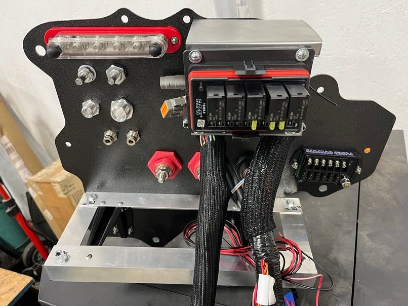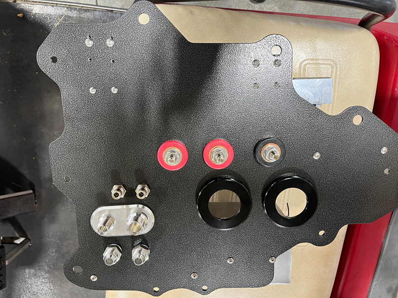 Well that didn’t turn out too bad. The BMR HVAC delete how holds the following: Eaton Bussman 5 Relay/ 10 Fuse box, Leash Performance Big Dog 6 way fuse block (for constant 12v), Leash Performance 1HO Single 70amp Relay Module (for ignition), Holley dominator ECM custom made mounting bracket, a pair of Deutsch HD20 47 pin bulkheads, barbs for the HVAC system. Also fittings for the AC pressure and return lines (#10 and #6), bulkheads for power and ground, a 5 way power distribution block, and some ¼” push lock nylon hose pass throughs.