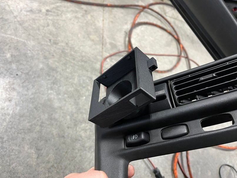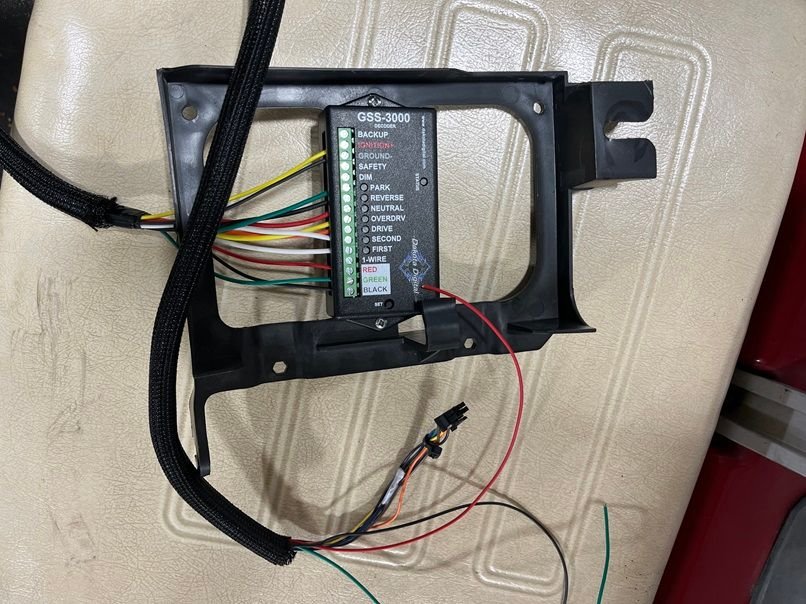 To be able to see what gear the vehicle is physically in, I’m using a Dakota Digital Universal Gear Shift Sending Unit GSS-3000 and Dakota Digital Alpha-Numeric LED Gear Shift Indicator DGS-1R. I needed to find a spot to mount this so I removed the factory Bosch traction control box located under the driver side dash and mounted the Dakota into the factory bracket. I had a friend custom print me a mounting plate that goes around the cig lighter for 3 buttons and the DGS-1R.