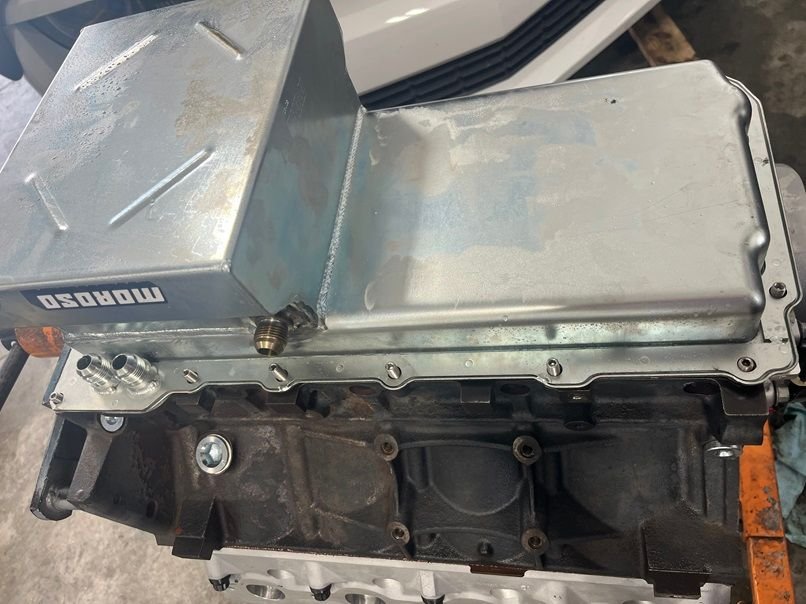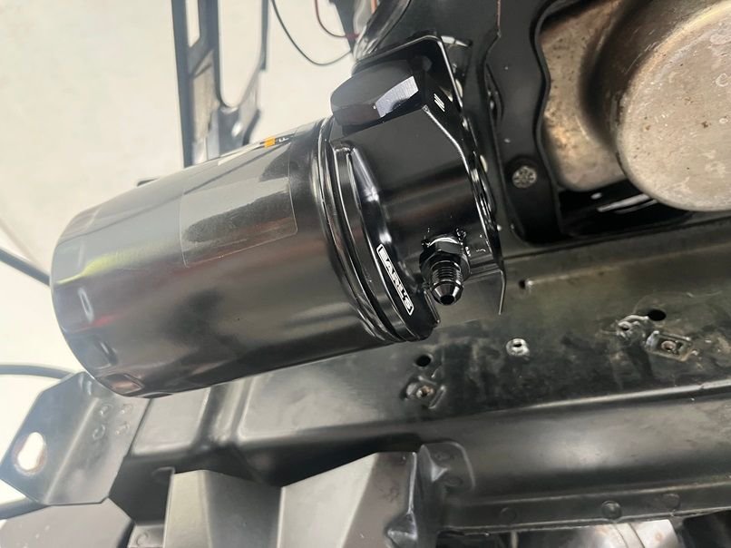 No room or an oil filter when using a Moroso pan, so a remote oil filter was used. Mounted and ready to be plumbed.