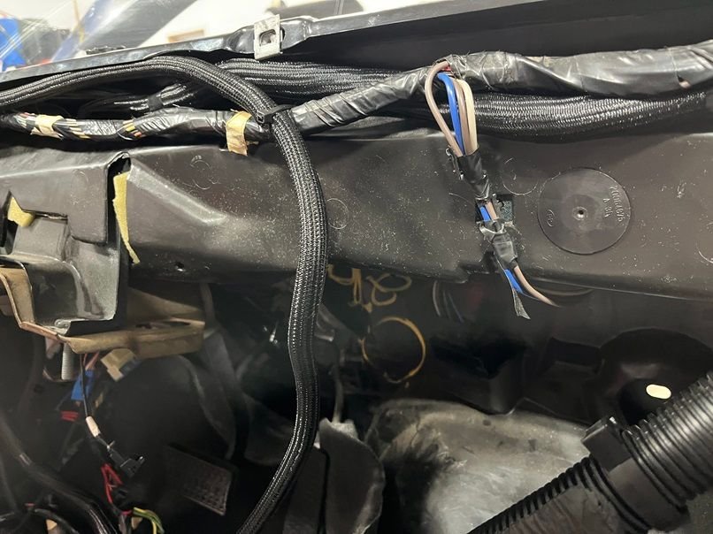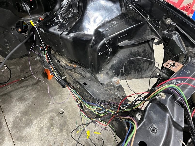 With the factory engine harness completely removed and the factory relay boxes removed, you are left with a mess of wires that come out of the factory bulkhead on the driver side. All factory wires on the passenger side that lead to connectors C101, C102 etc are completely removed. I retained any factory wiring in the engine bay that dealt with control of the wipers, horn, fog lights, parking lamps, and head lamps. Everything else was removed.