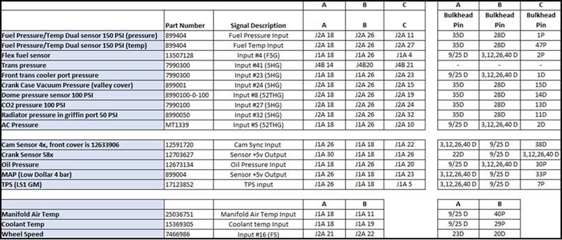 List of all sensors and part numbers used as well as connector pinouts.