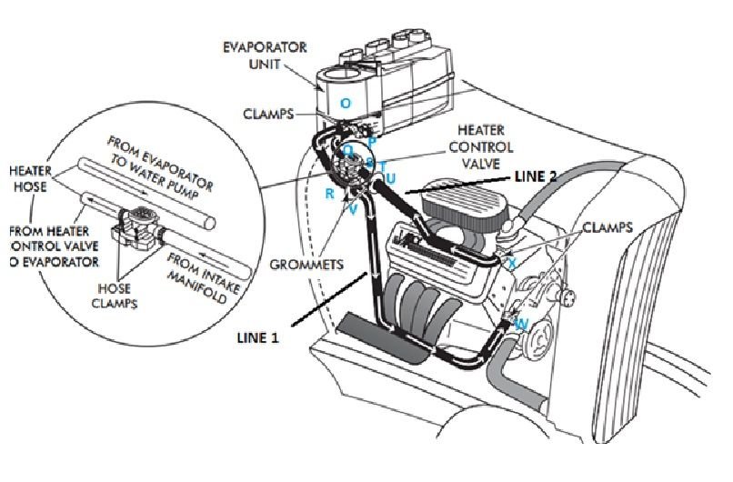 Fitting for line 2 attached at heater control valve (Q) – NO FITTING USE CLAMP
