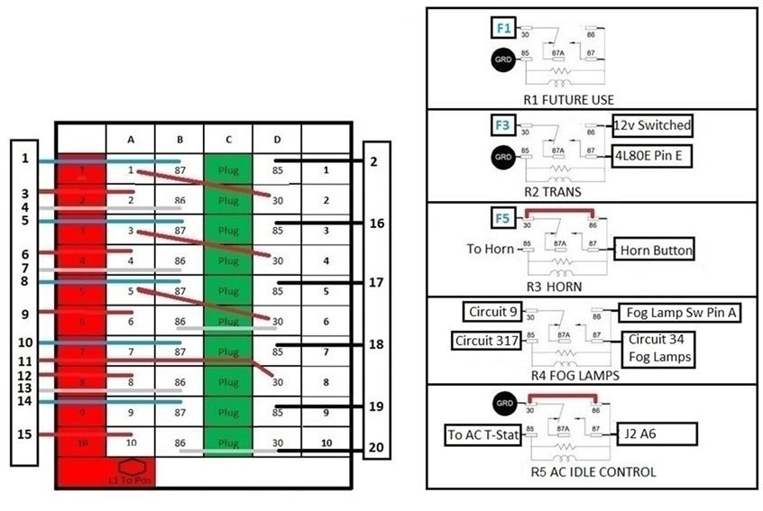 With the factory relay/fuse boxes under the hood removed, the custom Eaton relay box contains the following relays which needed to be installed upside down based on how the buss is ran. The relays are horn, fog lights, transmission, and AC. One of the relays is prewired for future use. The relays are Song Chuan 301-1A-C-R1-U03 12VDC Micro 280 SPST 35A. Wiring the relay box correctly means taking the time to map it out. I used Deutsch DTM 12 way and 8 way connectors to keep the wiring neat. Some of the required relays for this installation exceeded the maximum amp ratings. Because of this, these relays are not contained in the Bussmann, and are part of various aftermarket wiring harnesses themselves. These include the 2 fuel pump relays contained in the Racetronix dual pump harness and the relay on the Holley Dominator main engine wiring harness used to trigger fuel injectors and ignition coils. Theres also the Hella 40A relay used for the starter, and the Leash HO 70A relay for ignition. In addition there is also a relay for the aftermarket shifter where placement near the shifter is easier. While this relay could be contained in the Bussmann since it doesn’t exceed maximum amp rating, it was just easier putting it in the center console area based on how it is wired. The factory relays that were retained are the DRL behind the radio, the theft deterrent under the instrument panel, and the truck relay near factory connector C200.
