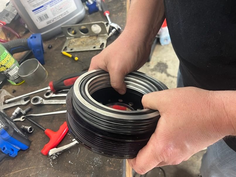 With the engine block already machined and back in our hands from BES along with CNC’d 823 heads, it didn’t take long for Charlie to button it all up. As mentioned previously, the engine is an L96 gen 4 block, 10.5:1 static compression, 4” Callies CCW crank with Molnar rods and Wiseco pistons built to handle the boost. 4.010” bore. 404ci. The ATI crank pulley that I had came with 40 durometer rings. We can’t just be throwing **** back onto a high hp engine that’s going to spin high without making sure the balancer is up to the task, so we replaced the 40 durometer rings with 70 durometer. ATI 91898070.
