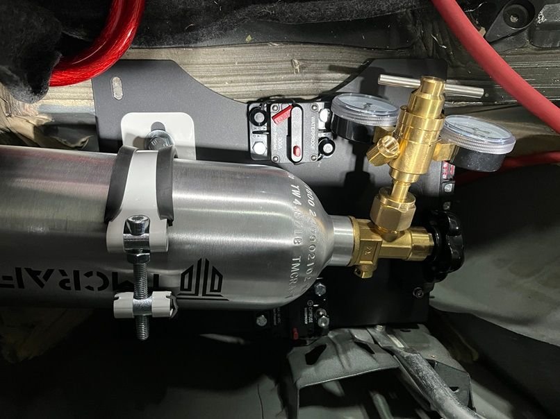 Since I’m fooling around with plates and brackets…. might as well purchase a F-Body Spare Tire Bottle Mounting Bracket SKU: 00-33001 from Nitrous Outlet and modify it to fit this CO2 tank I purchased off amazon. What a perfect spot to mount an MSD 4 bank solid state relay and some circuit breakers as well!