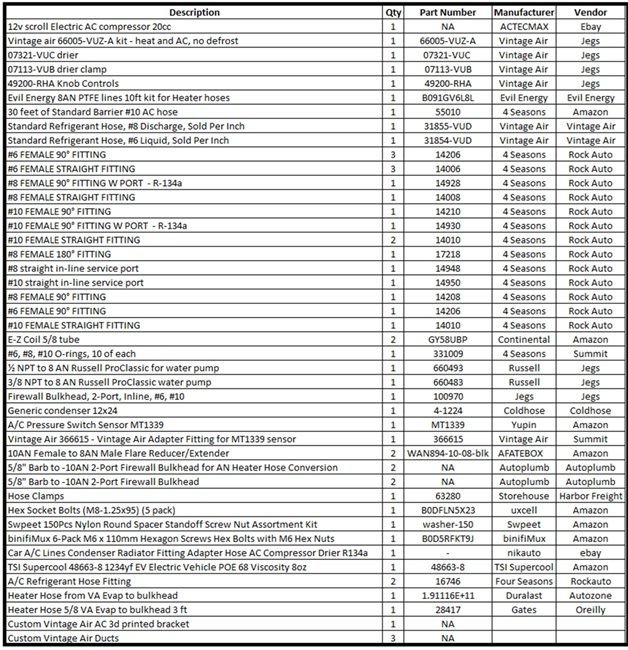 Everything on this HVAC system was pieced together. There is no universal “kit” that covers it all. An MT1339 pressure sensor is used on the high pressure side and plumbed into the drier which is a 07321-VUC. A Vintage Air adapter fitting 366615 is used to adapt the sensor onto the drier. The full list of HVAC parts can be seen in the image below. Andrew (Dr. EFI) clued me in on this pressure sensor and what is needed to set it up!