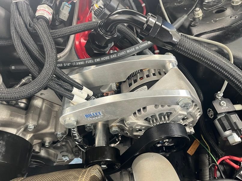 Alternator relocation bracket is a Billet Speed alternator bracket and Adjustable Idler System *Type 1* - Standard or Electric Water Pump LS1 LS2 F-Body (4th Gen) Camaro & Pontiac GTO. We needed to shave 0.325” off the billet spacers that came with the alt bracket so that the belt would align properly. I wish things would work right out of the box but sometimes they don’t. Details of the front accessories are as follows: