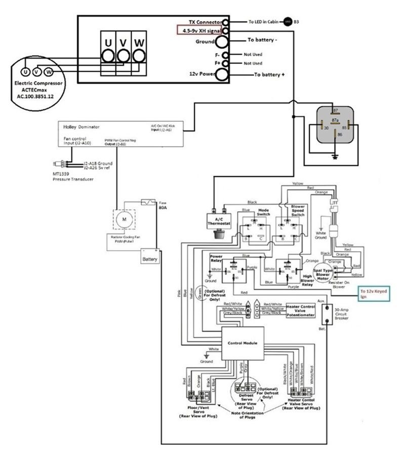 When using an electric AC compressor, there is no need to have an output on the Holley for a relay going to the compressor to control activation. The idle up feature will compensate for the additional electrical load while the compressor is running at low RPM. Since this isn't a belt driven compressor, there is no need for WOT to kick off the compressor under acceleration.