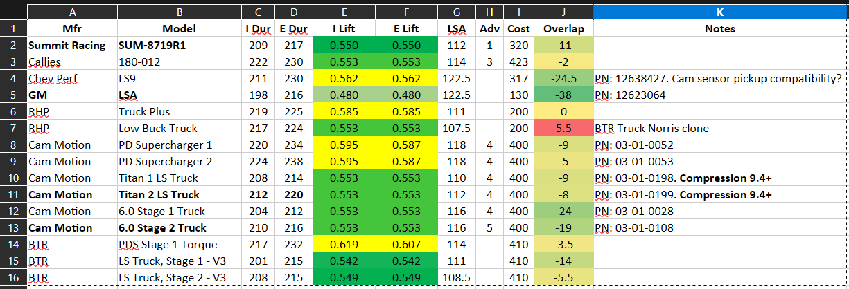 I understand camshaft basics, but not to the level of determining valve events that are best suited to a particular application. In the table below, I have bolded the cams that seem like a good match for my goals. Which would you choose to have performance equal to or better (for a heavy truck application) than the Low Buck Truck, but with a more civilized idle? What others have I missed? Even general guidance would be appreciated.