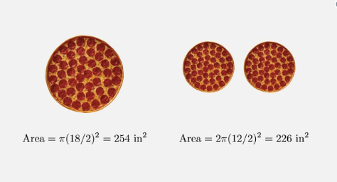 4' pizza - 3.1416 x 2 x 2 = 12.5664 (4 x the 2' pizza)