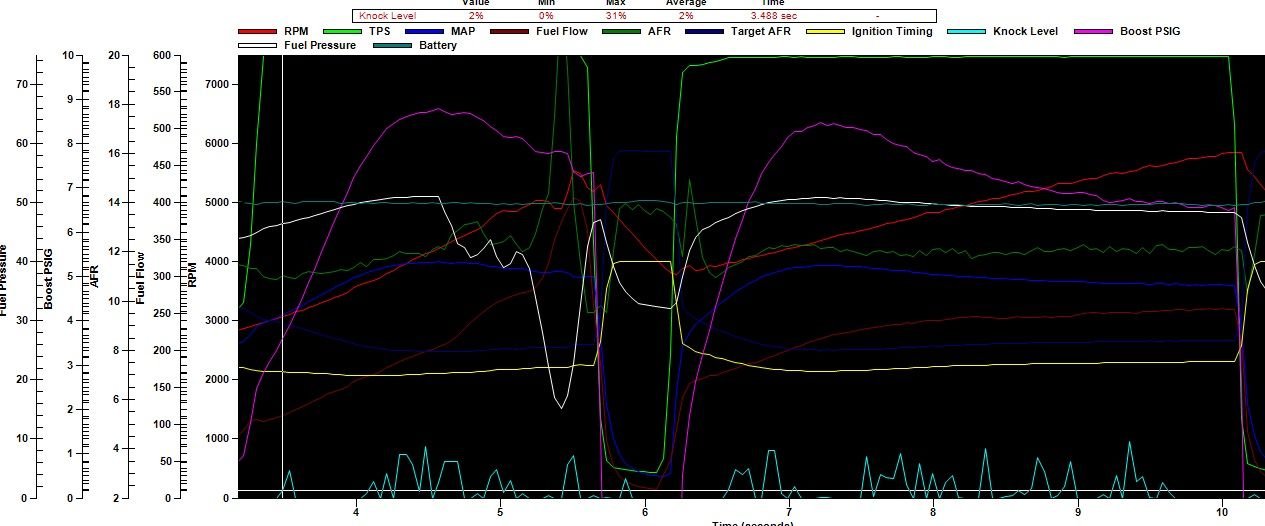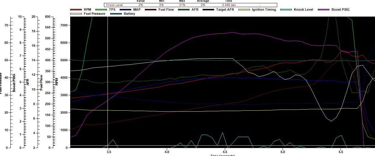I have only driven the car a few times before winter set in. Out of the few times I have driven it the fuel pressure has dropped sharply from 44 psi to 15psi. This isn't a gradual drop, it's very sharp. It has only happened in 2nd gear for whatever reason. When it happens, the car instantly loses all power. Then inexplicably, after I let off and get back in it, during the 3rd gear pull it's steady up to 6k. Car was running 1/2 tank of gas during the pull. I've attached a log file to show what I am taking about.
