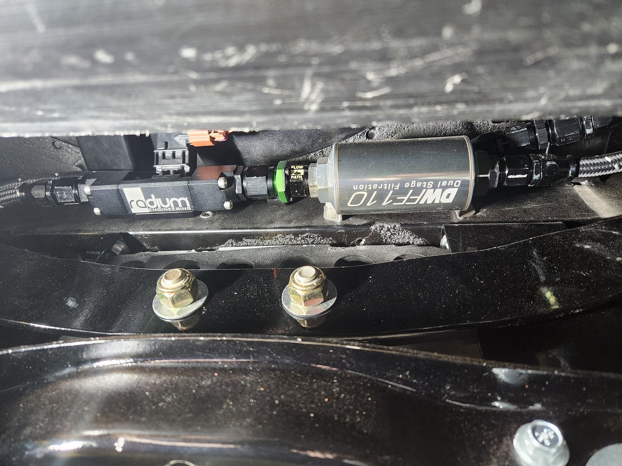 2000 Camaro V6 fuel tank New Herko replacement fuel bucket Walbro 595 fuel pump F90000295 10ga wire from battery to pump Holley Hydramat 3x15 part 16-111 8AN feed and return PTFE fuel lines with section of Nicopp hard line Deatschwerks 8-03-110-005K-8 5 micron fuel filter Radium 20-0589 Split-Flow Flex Fuel Sensor Adapter Radium 20-0534 Universal Check Valve GM 13577429 - Flex Fuel Sensor Racetronix fuel regulator set to 44psi, bolted to inner fender Fasster fuel rails