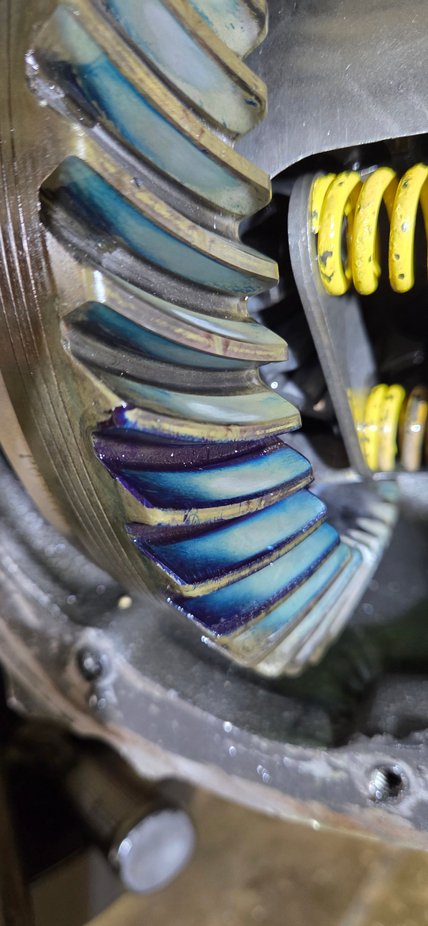 So I have a 87 c10 that had 3.73 gears and i wanted to go to 4.11s so I bought some jegs brand gears and proceeded to try to set them up. I could never get what I thought was a acceptable pattern so I got it as close as I could put it together and went and drove it. Needless to say it made way to much noise. So I ripped it apart and changed my pinion depth and put it together and tried again. No go. Anyways long story short i could never get it to run quietly so i sent the gears back and bought a new set of 4.10s from revolution gear and axle. Yesterday I put the gears in and this is the first pattern I come up with. Now before you cook me in the comments I do have some actual gear paste arriving tomorrow. But Prussian blue is all I have for right now.