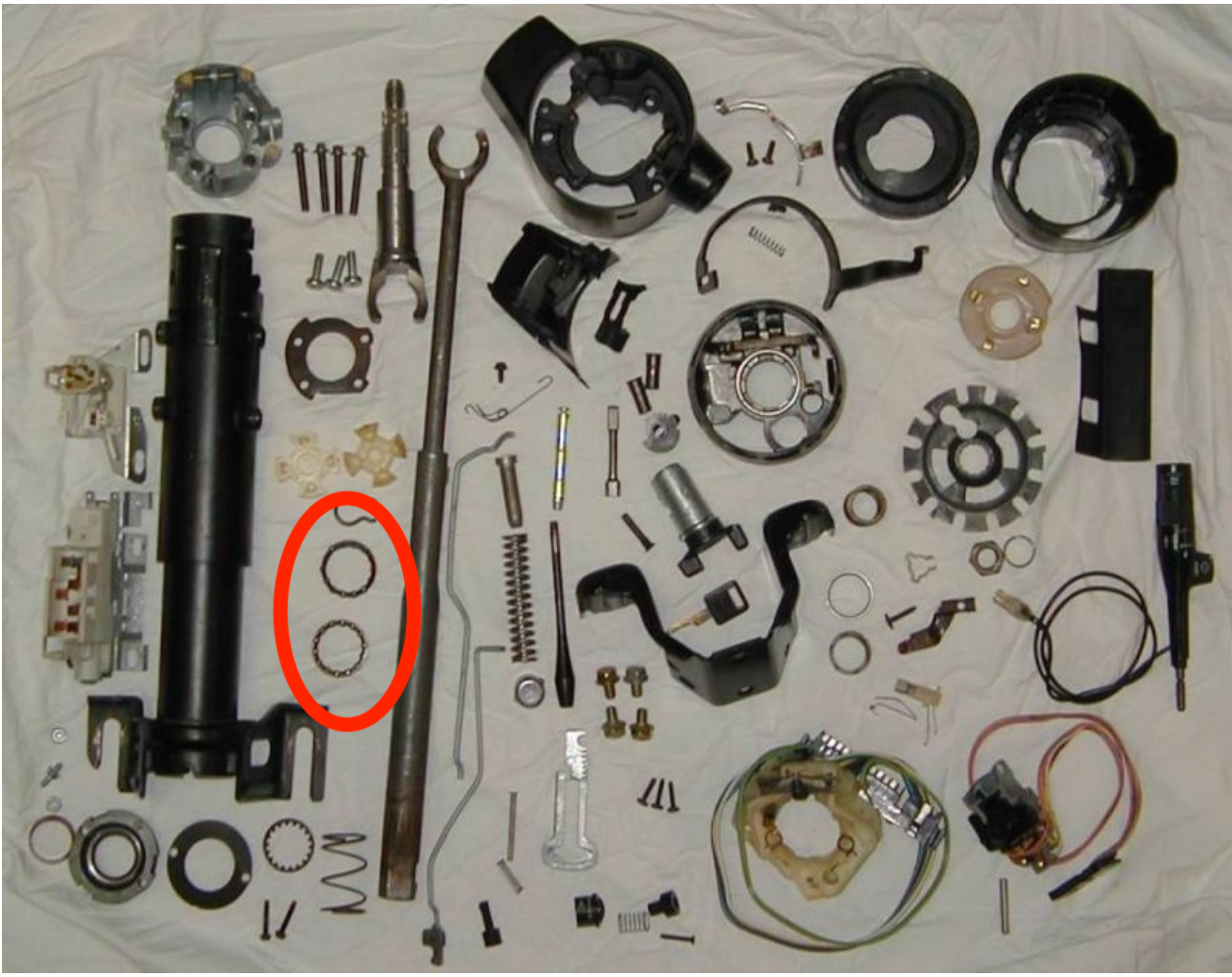 That isn't your picture. Its from the Jazzman Steering Column Rebuild guide. Did you follow it thoroughly and see if the answers are in the step-by-step instructions? He takes all of these parts and shows how they go back together.