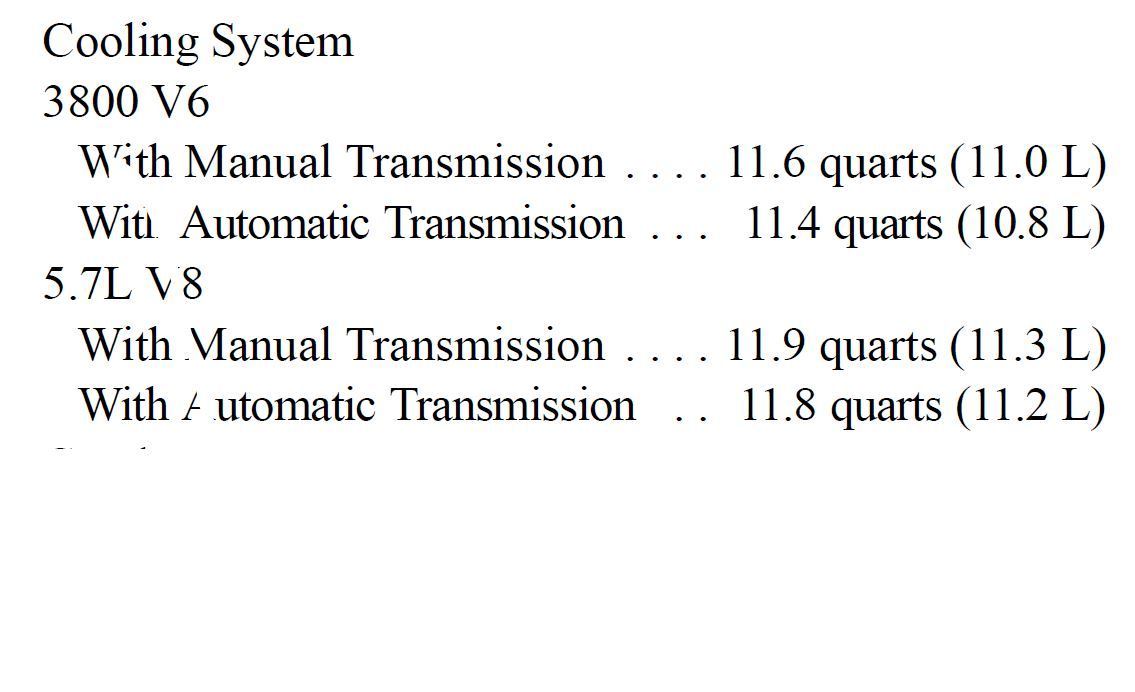 I believe the whole cooling sys holds 15 quarts for automatic trans cars. I was able to pour 1gallon, 3 an half quarts of tap water into rad. Running her for 5 minutes w/out the rad. cap letting sys. Burp out trapped air.