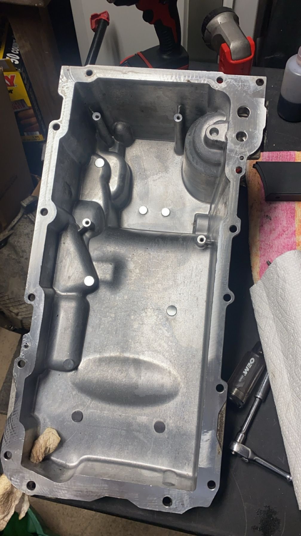 @Che70velle This is an aftermarket pan with a aftermarket pick up. Pan part number is 12624621. It’s a GM LH8 muscle car oil pan off of BRP hotrods. I don’t know what to do. As said before the pan moves back after tightening. If it is the pick up tube hitting the baffle in the sump could I trim it with a carbide bit? I don't want to redneck engineer this but aside from possibly getting a new pan I don't see a lot of options here. By the way I'm not 100% but I think this is the way the oil pan was before I pulled the motor, of which didn't cause a lot of issues. also, with the lower bellhousing bolts.