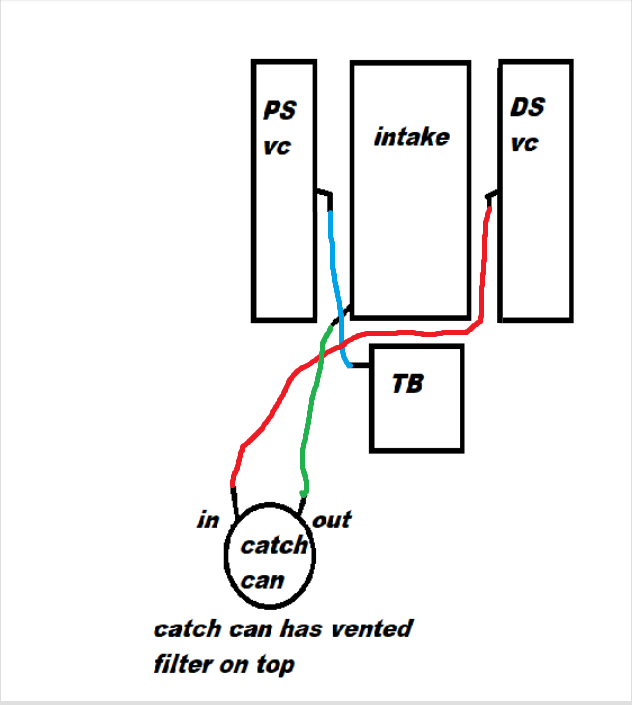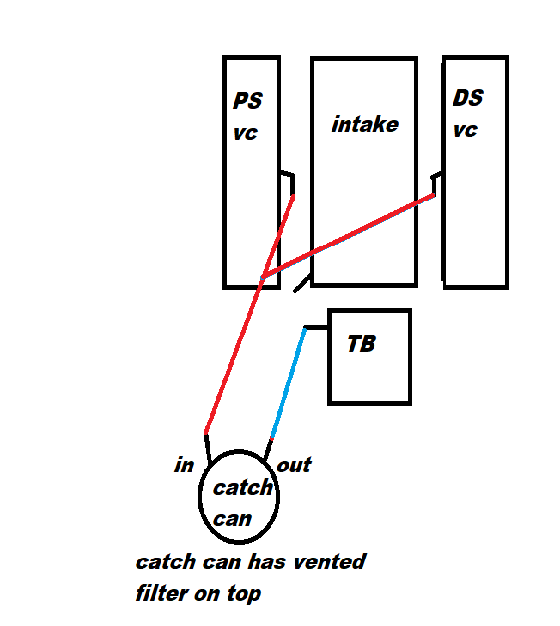 (and opening for it sealed off), then from the catch can to after the TB. This way there will be airflow thru the engine. Your diagram does not allow that.