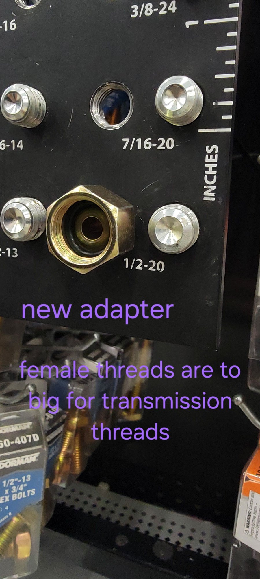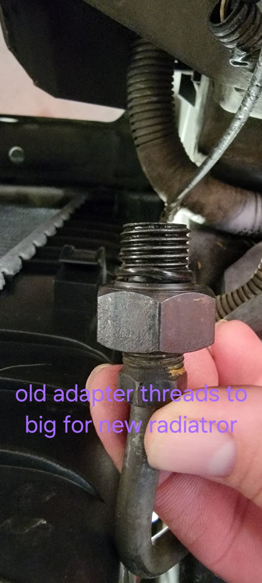 I need to replace the stock radiator on my 99 trans am. However the female thread adapter for the radiator is too big for the male threads for the transmission line. If I thread the transmission line directly to the radiator , it does not make a good seal. I bought the radiator from orileys since the last one lasted about 10 years. I bought two different brands, but they both have the same thread adapter. I have not been able to find the correct size adapter anywhere for this set up. I think I need 1/2 20 female to male adapter. Can you help or point me in the right direction?