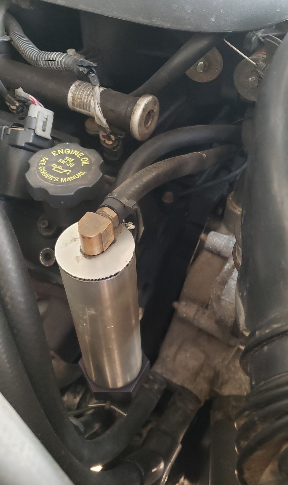 So what I did is I have a fitting on each valve cover that I routed an lines to my catch can. I mounted my catch can on the front of the frame rail with a couple of rivnut fasteners.