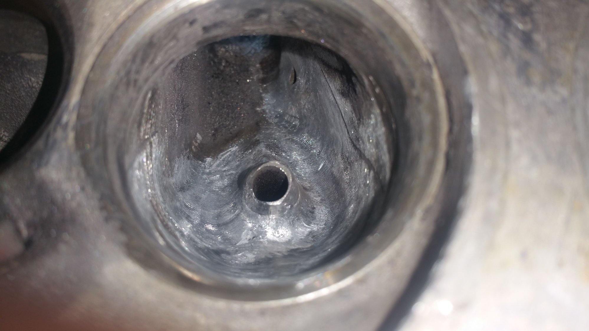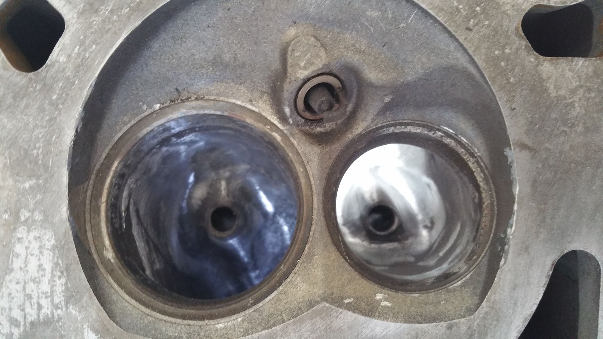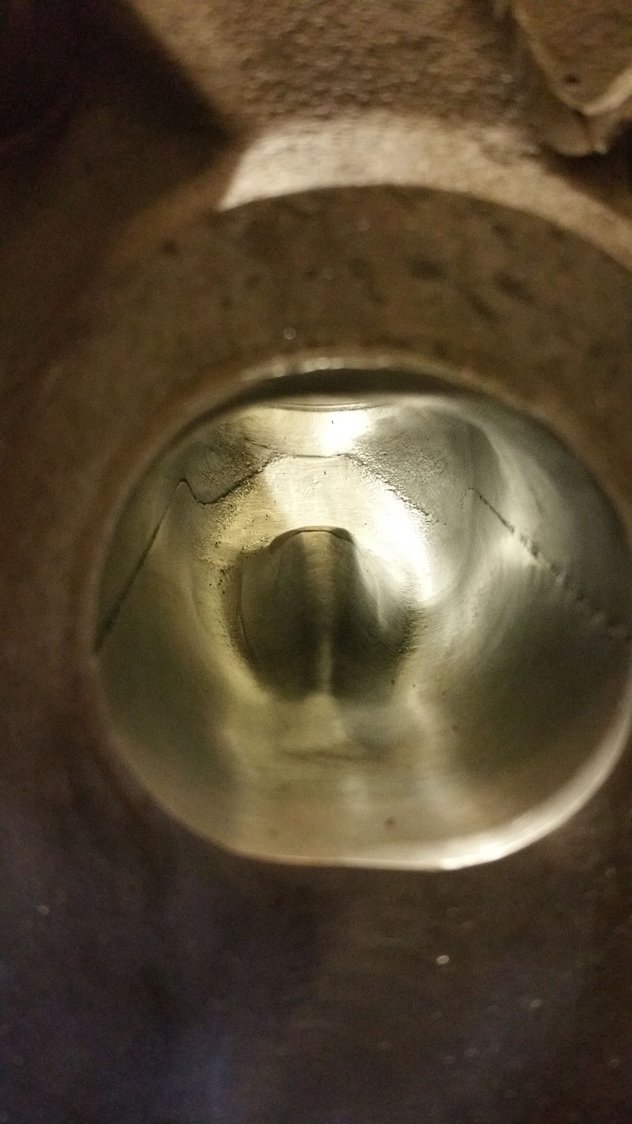 moving on with life got up this morning and started back on the exhaust port .as you can see in the picture what I have done was take off the ridge of the exhaust port seat with my deburr bit.I just kind of worked my way from the outside edge on to the center.the exhaust port is extremely shallow compare to the intake port so you really have to be careful and it really doesn't take much time to remove the material compare it to the intake port.