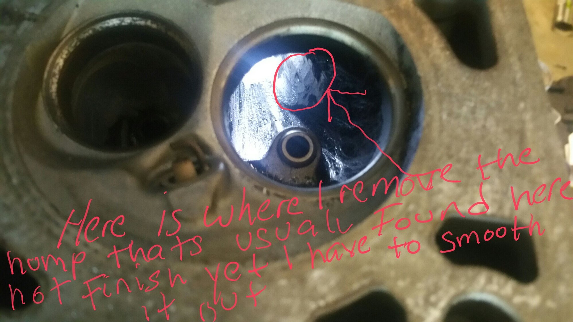 this is how it looks after the hhas been removed. now there was nothing that would help restrict flow.to be honest with you guys I really don't know how much flow you will gain from removing this hump but I do know that it is necessary.