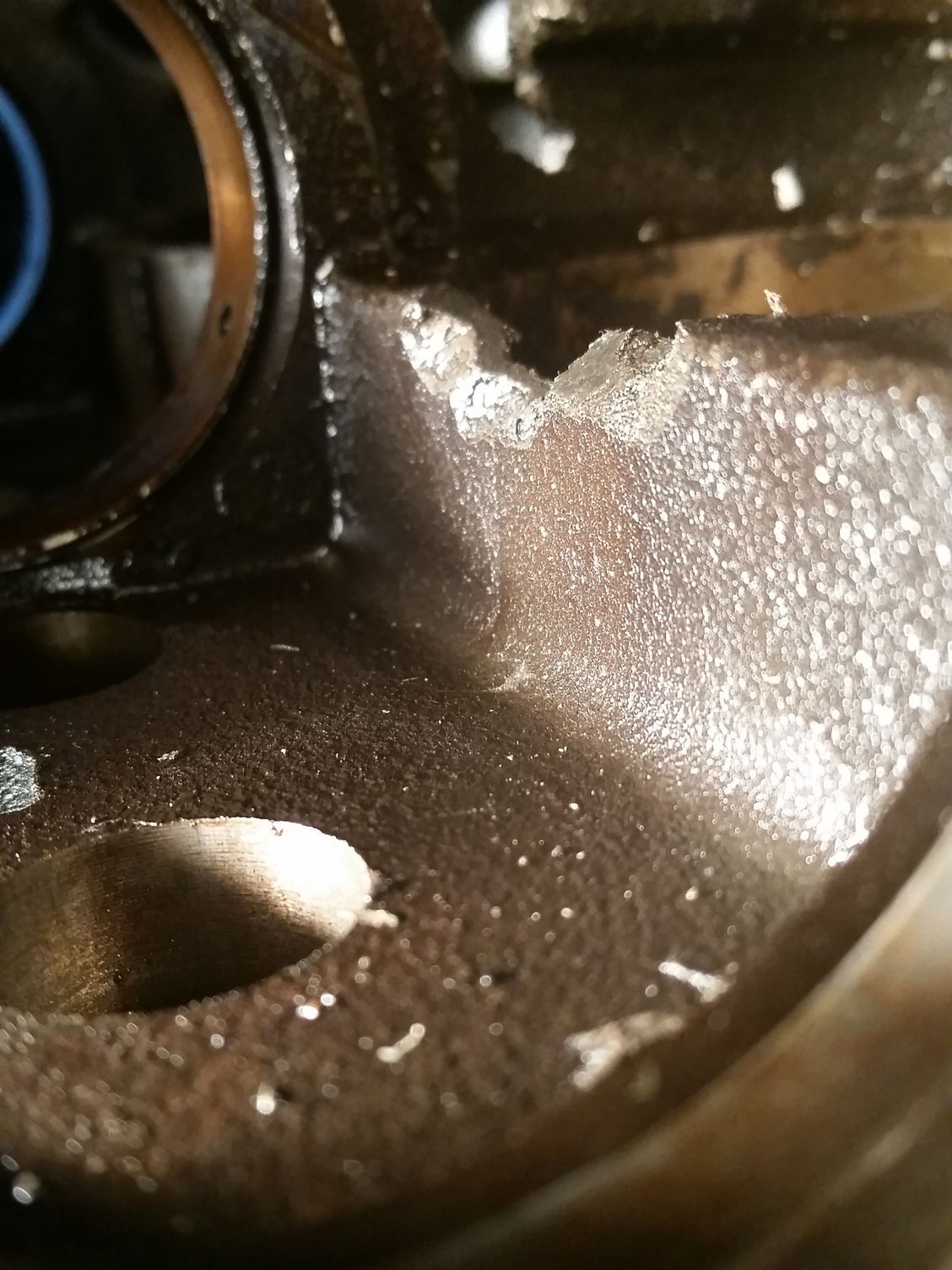 A stroker might be machined at the base of the cylinder to provide clearance but that is a different operation than debris smashing around and potentially cracking beyond the missing material, like possibly to water.