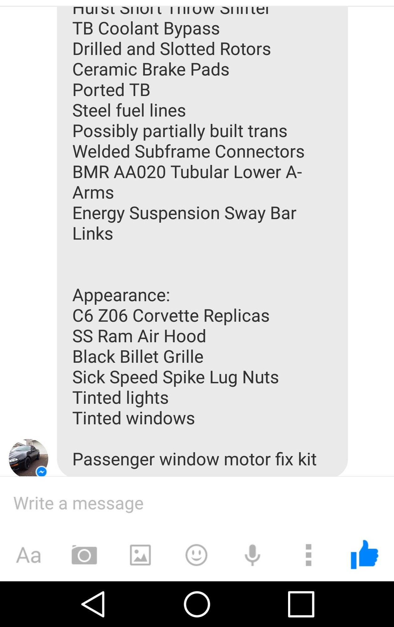 I recently bought a 2000 z28 m6. It has a mild build but i wamt a bit more out of it. I definitely want to put a cam in it and the rest is undecided. The only things i know forsure that are done to it is heads, air lid, intake, long tubes, ory, catback, tubual lower control arms, sub frame connectors and short throw shifter. The rest the guy i bought it from said they previous owner did. I would like to get the car around 450-500hp but it has to retain drivability because its a sunday cruising car amd will be driven a couple hundred miles. Id like to stay under 3k but may spend more. I attached pics of the mod list.
