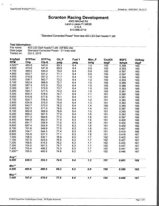 So there you have it. Two very similar builds done by highly capable builders with similar compression, cams, intakes, headers etc. The smaller 403" engine, with a smaller 4.005" bore made more torque and horsepower than the 418" engine with a 4.070" bore. The difference? Cylinder heads. The Pro1 LS3 heads made 10 more ft lbs of torque at the same RPM than the cathedral port heads and 30 more horsepower at 200 RPM higher. Also, the cathedral port engine used a vacuum pump which boost power while the square port engine did not.