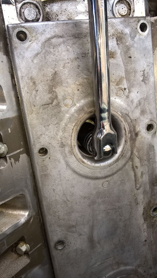 Right now, I have bigger issues. My knock sensors are freaking stuck! I broke the torque on them with a 22mm socket. From the look s of things they should just screw right out by hand. Well, mine won't come out at all. They spin with a socket, but they won't come out. I tried to pry the valley cover up with a screw driver, but it feels like it's getting stuck on the knock sensors. I can see the knock sensor spin where the socket touches it, but the outer portion (case-ing?) doesn't spin. WTF? Is the sensor stripped out?
