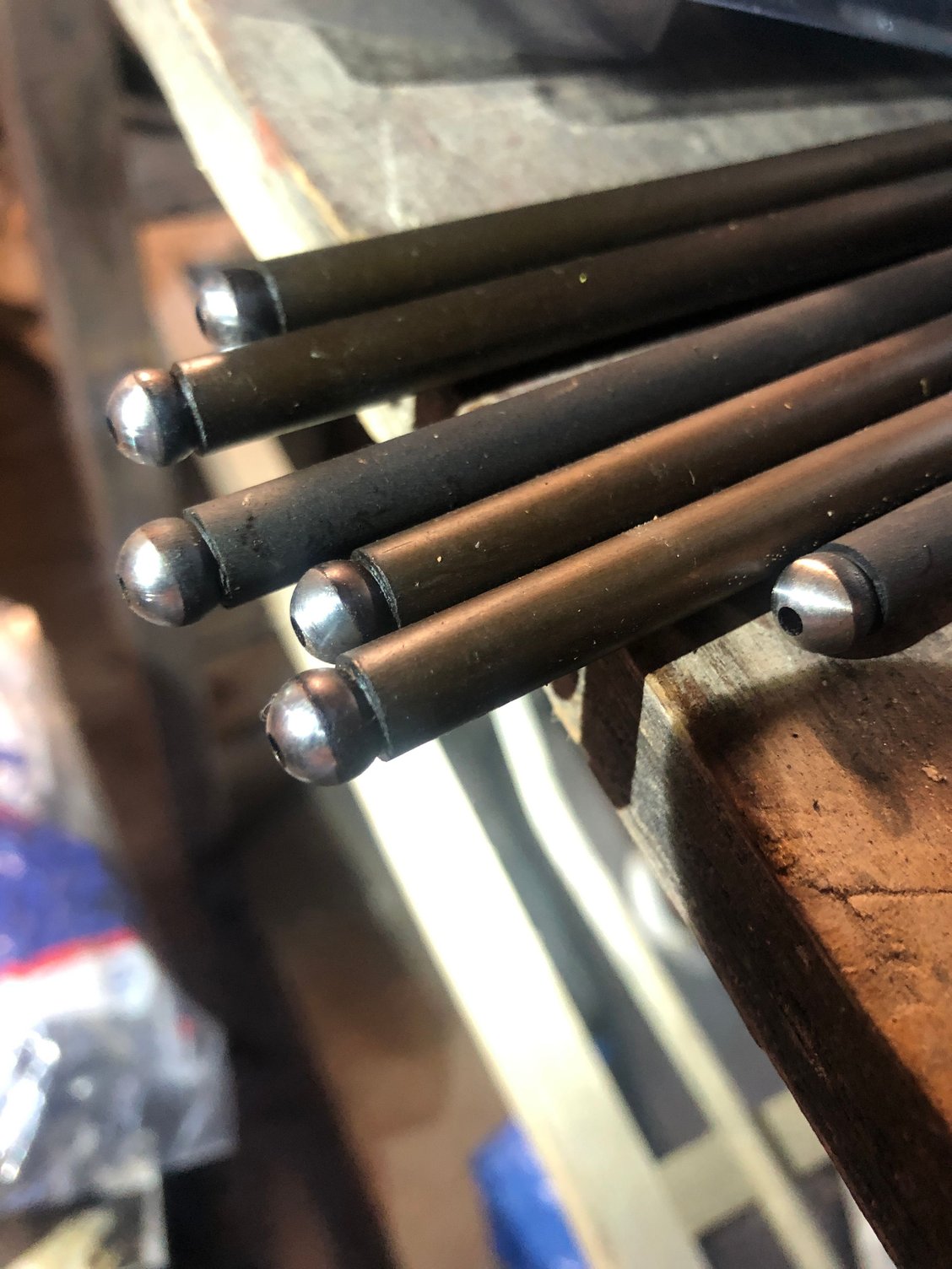 Those push rods are stock 3-piece POSs. Even if the 2 of them weren't UTTERLY DESTROYED (the 4th one down is similarly ruined too, just not as bad yet), they need to be replaced, unless you're putting a stock LM7 cam in it or the like.
