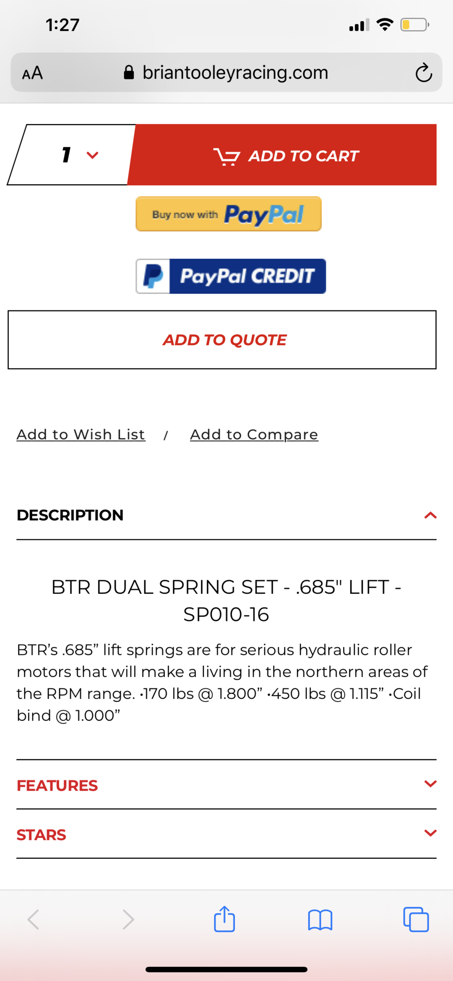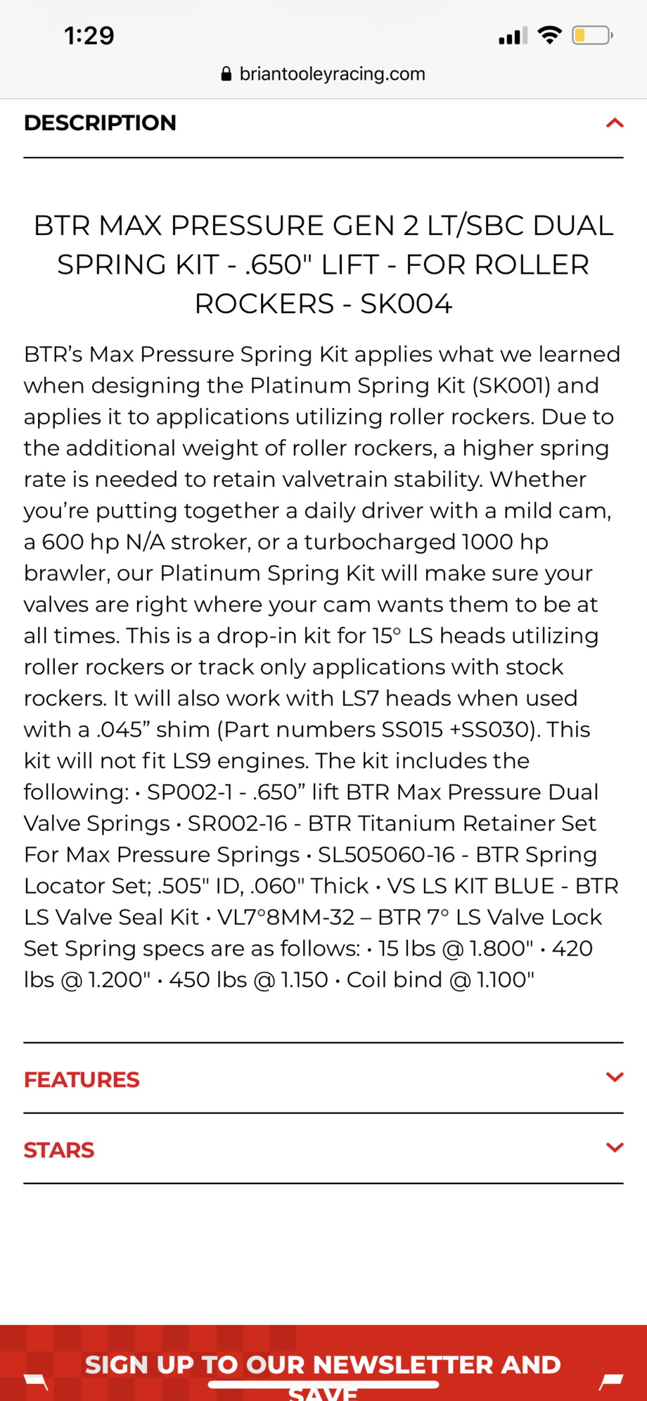 Normally I run the btr .660 kits, ran tons of them with no issue. My new build has a large 253/261 .651/.650 cam and I thought I had better step up the valve springs. So the search began, and I ended up on the BTR .685 lift titanium kit, roughly $60-80 more than the .650 kit. Great! Advertised as a stout spring made for high rpm operation. Perfect, just what I need. Bought them!