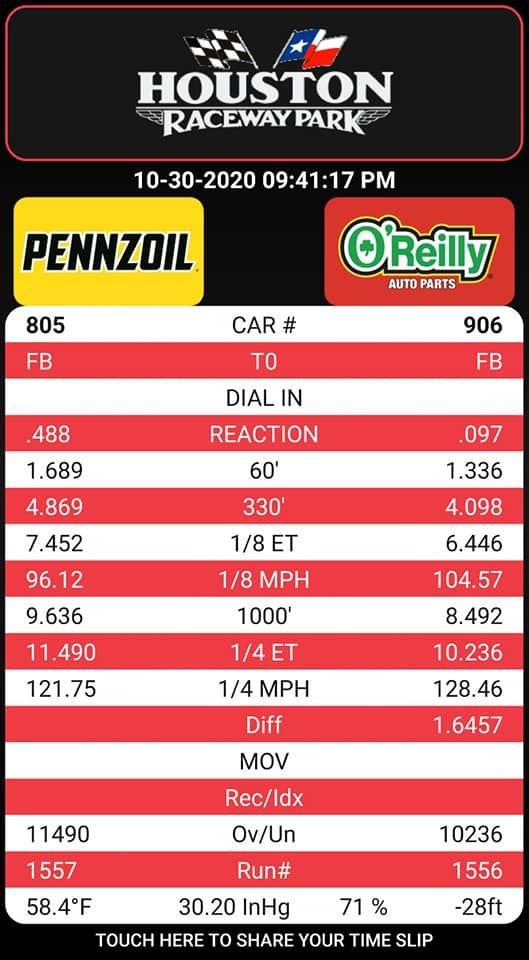 Went 11.49@121.75, poor 1.689 and 11.496@121.95 - 1.691 60'. In hindsight I should have aired up the hoosiers and let it roll out. Car would dead hook at 4800-5900rpm and just bog.