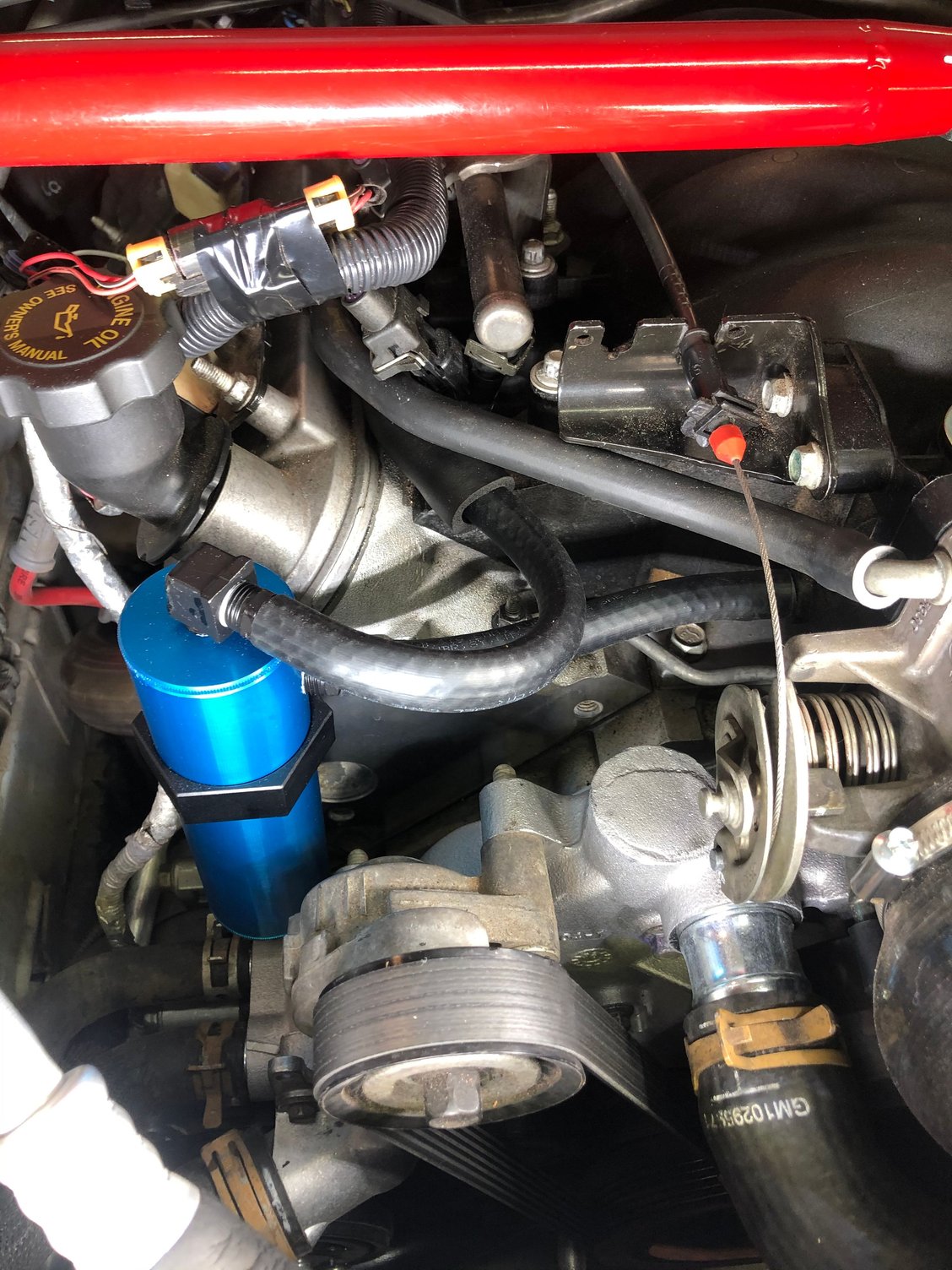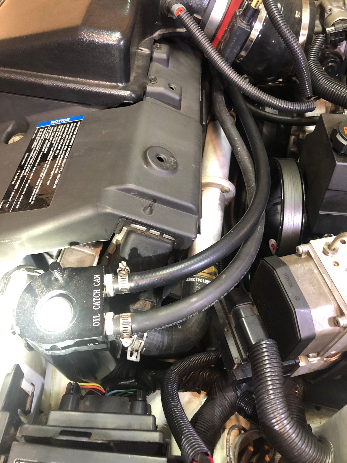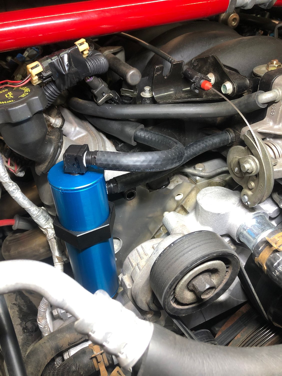 This line is going to inlet side of the catch can Catch can. And this is on the driver side by the front light, so roughly 24”-30” of hose ran for both in and out. Is this to long of hose? This is where the out is going to the intake manifold