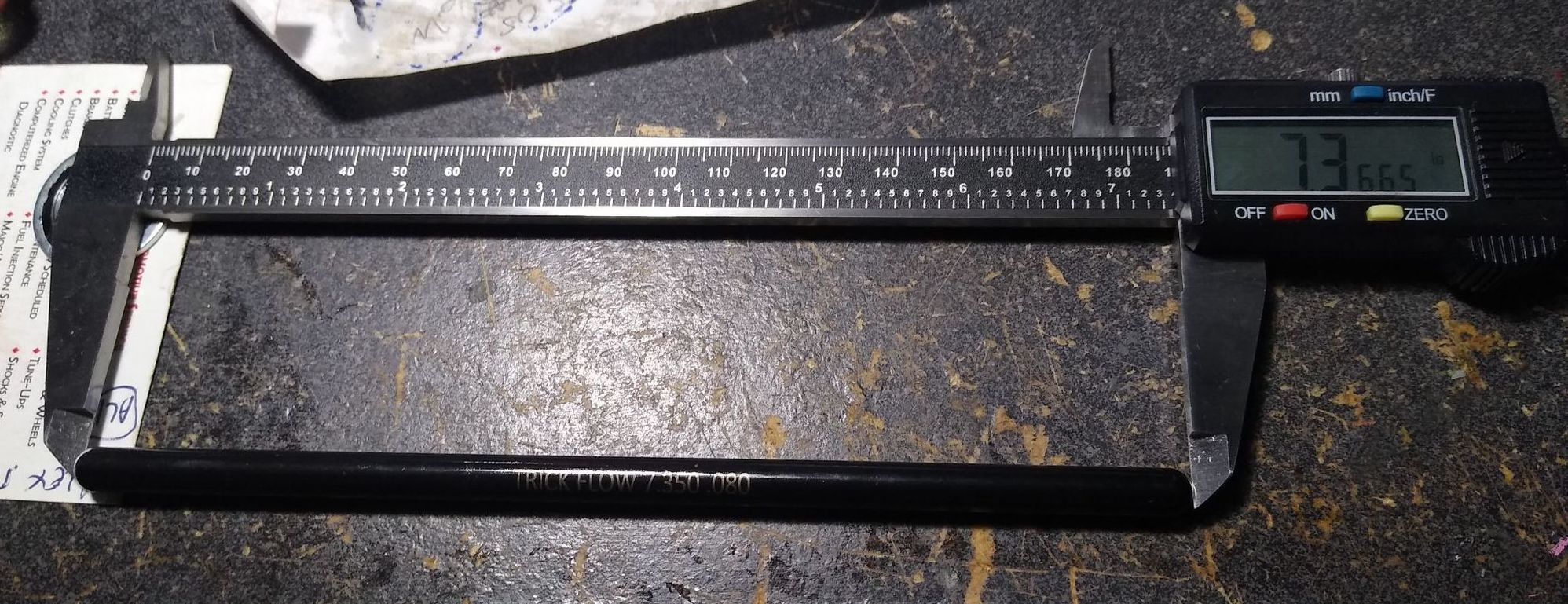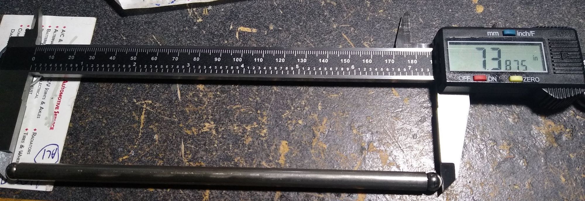 The Trick Flow pushrods arrived today, and I guess 7.350 is not really 7.350- I know different means are used here by different manufacturers, but in keeping apples to apples, I did end to end on my OEM ones. The TF ones are marked 7.350, but on my caliper end to end they are 7.3660, + .016 (the caliper read 7.3665 when I took the pic below). I measured different rods several times and got this same measurement. I re-measured one of my OEM ones and got 7.3875, so the new one is only .0210" shorter vs the calculated .0375".