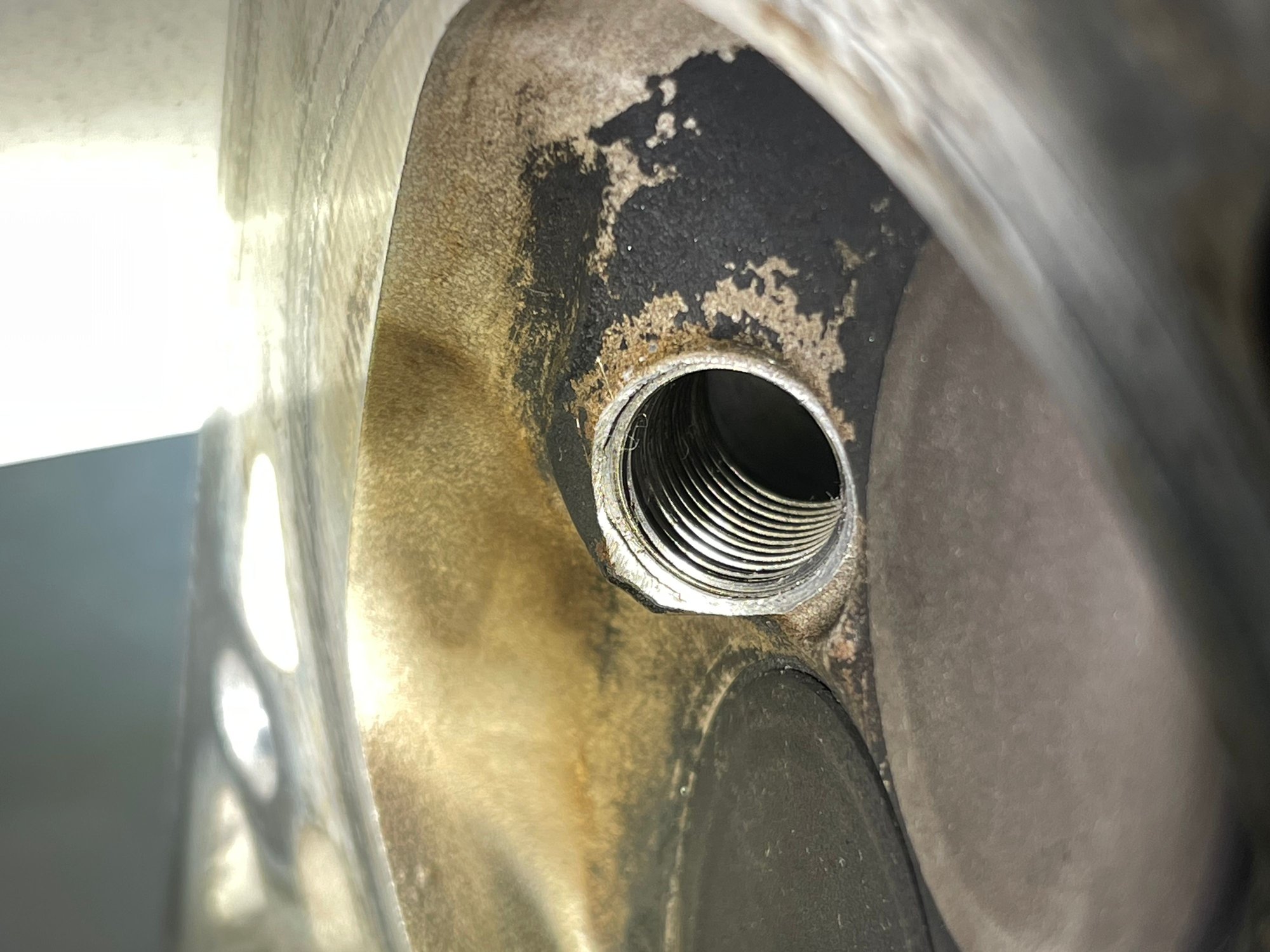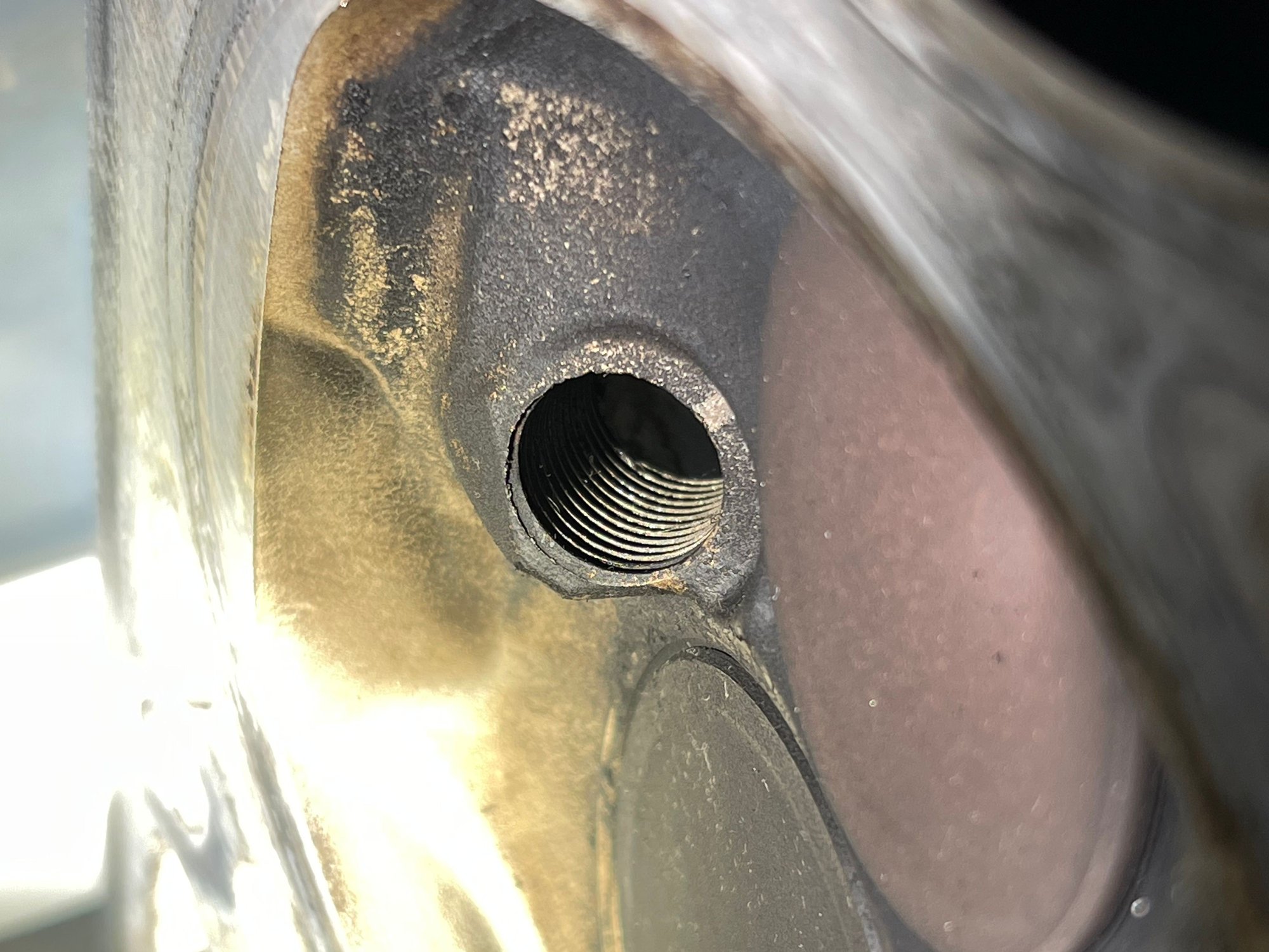 This is a spark plug hole in a 243 head that has been rethreaded with a Time Sert and filed to make it cleaner.