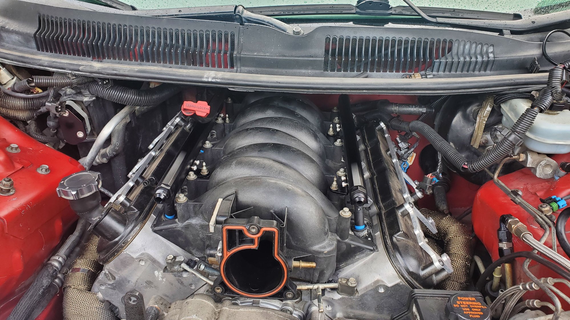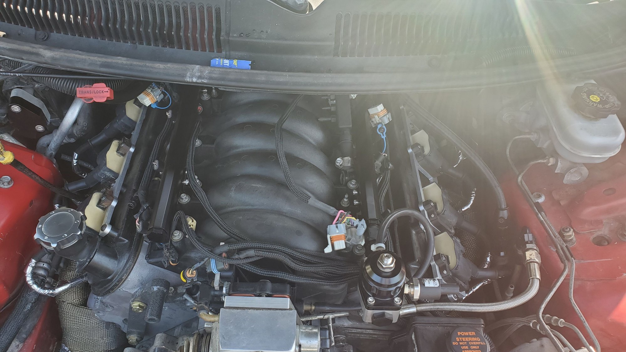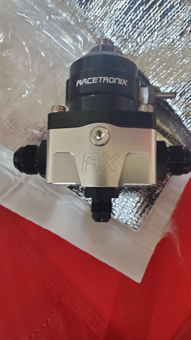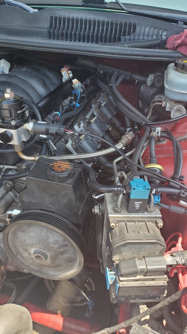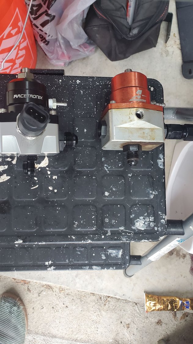 I need this weather to knock it off though lol 94 out yesterday, and this morning was muggy as hell lol just want a cool day to work more consistently lol getting spoiled as I've gotten older testing the fitment of 80lb injectors in the fuelrail. popped in pretty easy. Deka 80lbs injectors. trying to figure out which way to run this. probably gonna hang it on the fuel rail like before. initial test fit. had to pull them back out and put the crossover on the back. i wanted to run the crossover in the front, but with the alternator on the passenger high side, and the feed line a bit too long on the front, had to run it in the back. had to move the trans tube a bit to fit it better. Had to slightly shave around the base where the bolts touched a bit. the old aeromotive had 6an inlets. the new racetronic is an 8an inlet, which lets me remove the 4an and 6an adaptor off the old stock rail and use 8an from the get go.