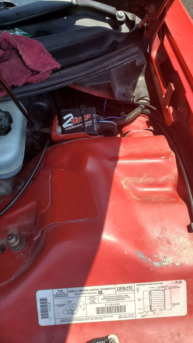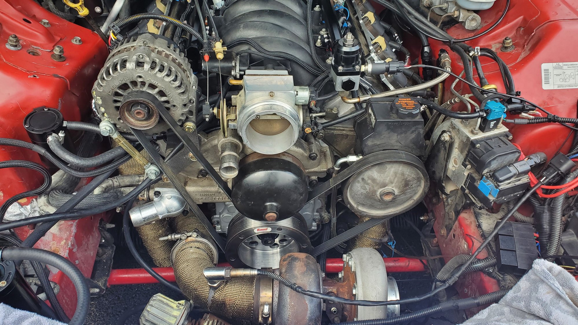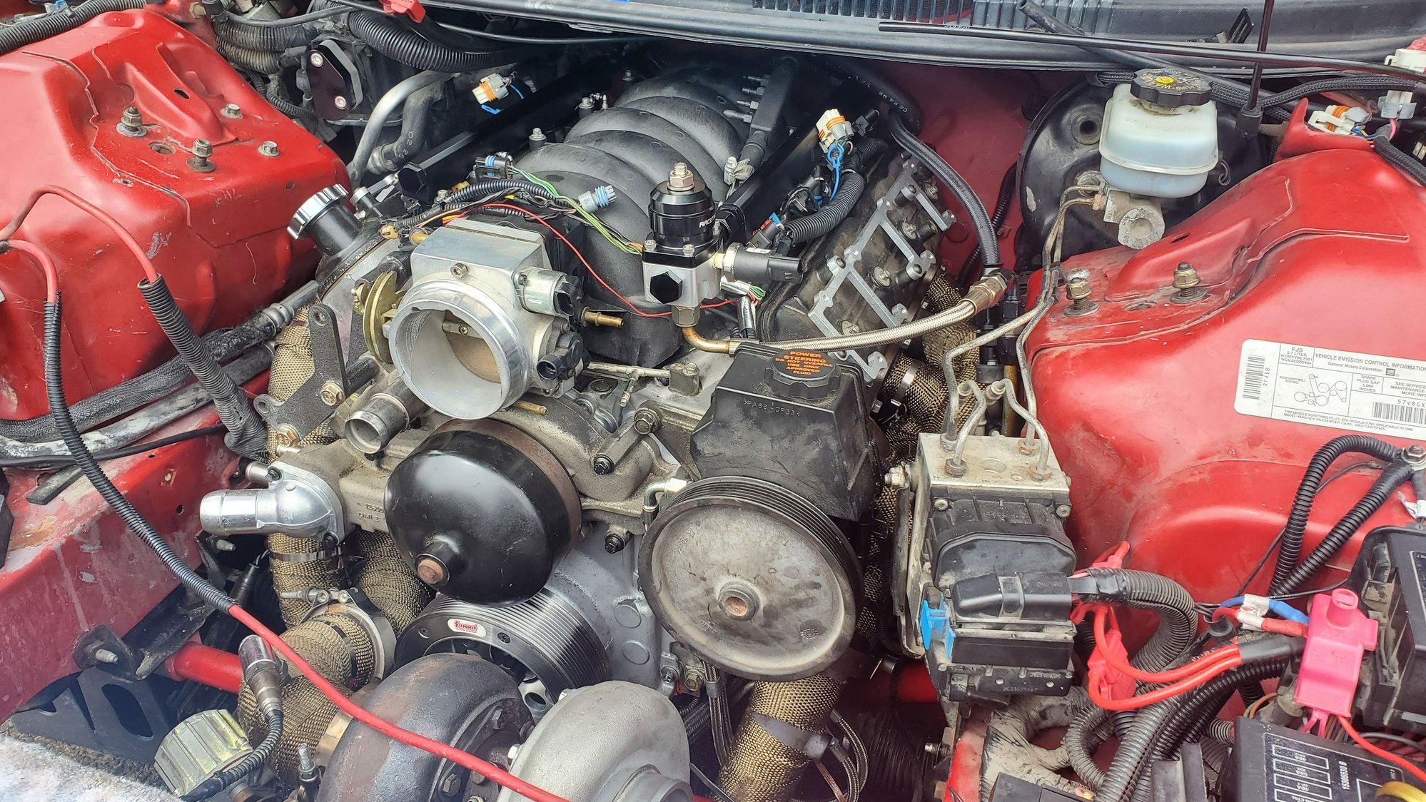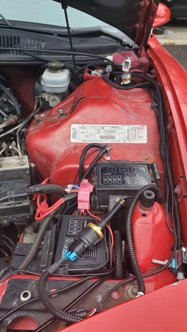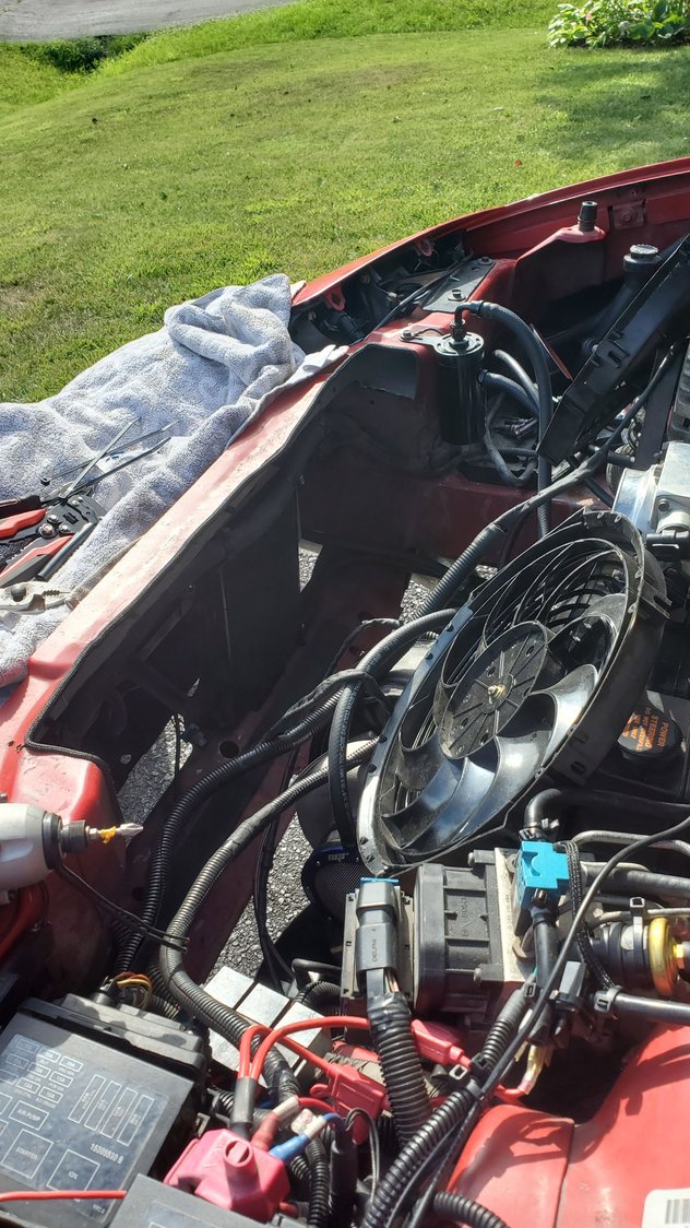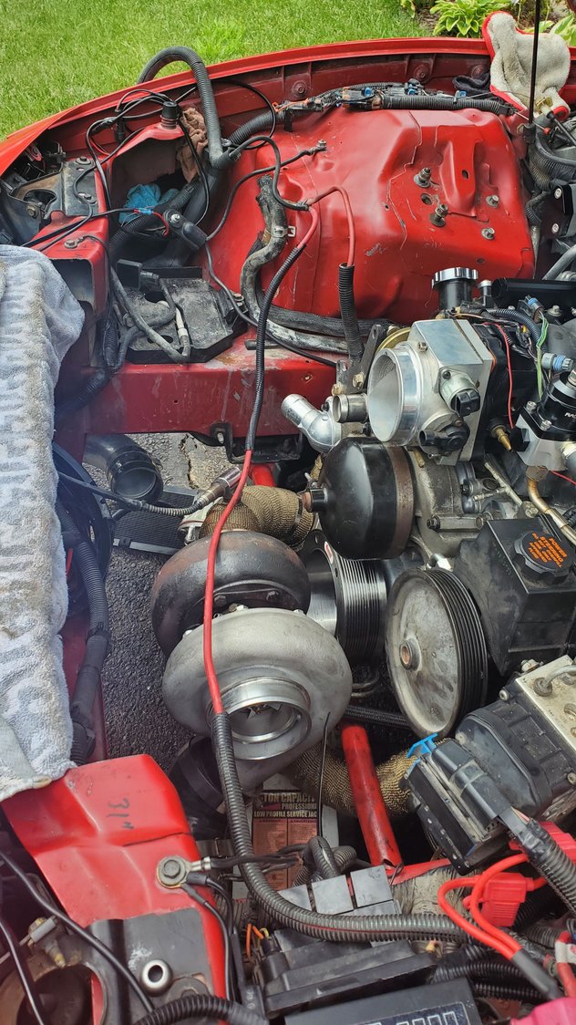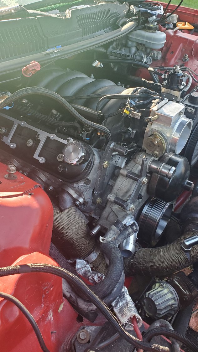 I think im gonna go the puller route for bettwr fan cooling. it will also let me run my trans cooler in a better spot, as well as put my little washer/meth tank near the stock washer tanks spot. did some wire cleanup a heat shield for the positive and ground wire nice and tucked in now so i did some plug wire work to prevent the cxracing headers from cooking the wires like before. heres previous wires, although not entirely from the headers lol this was from a freak fire previously. wire prepping half way there all done started sticking the plug wires back in. as you can see, its abit tight in there. driverside is a bit easier. gotta wait to fully bolt the merge pipe. gotta get a new 2.5" vband flange cleaning up the coils coils and plug wires all set. just wating on a new set of coil harnesses, and then i can plug them and the 2step back in. working on the vacuum lines. even eliminated needing one of the sources off the manifold. hiding the 2 step prepping the wastegate and BOV references. running the wastegate under the throttlbody to thw turbosmart soleniod. running the bov off the throttlbody nipple thats always juat sitting there lol finally found a spot for the catch cans. running one for the ls6 valley cover back to the manifold nipple behind the throttlebody. running the other catch can from the passenger valve cover and then back to the turbo inlet for a vacuum to draw out pressures. once i get everything nice and sorted, thw alternator will go back on cleaned up a lot of the vacuum lines and wiring tucked a lot better.