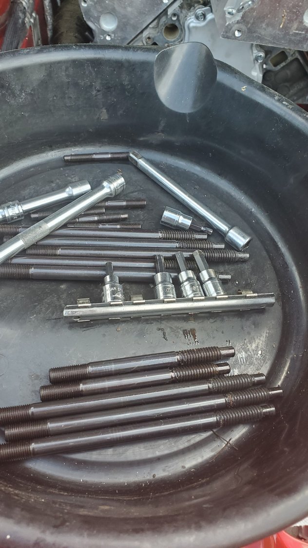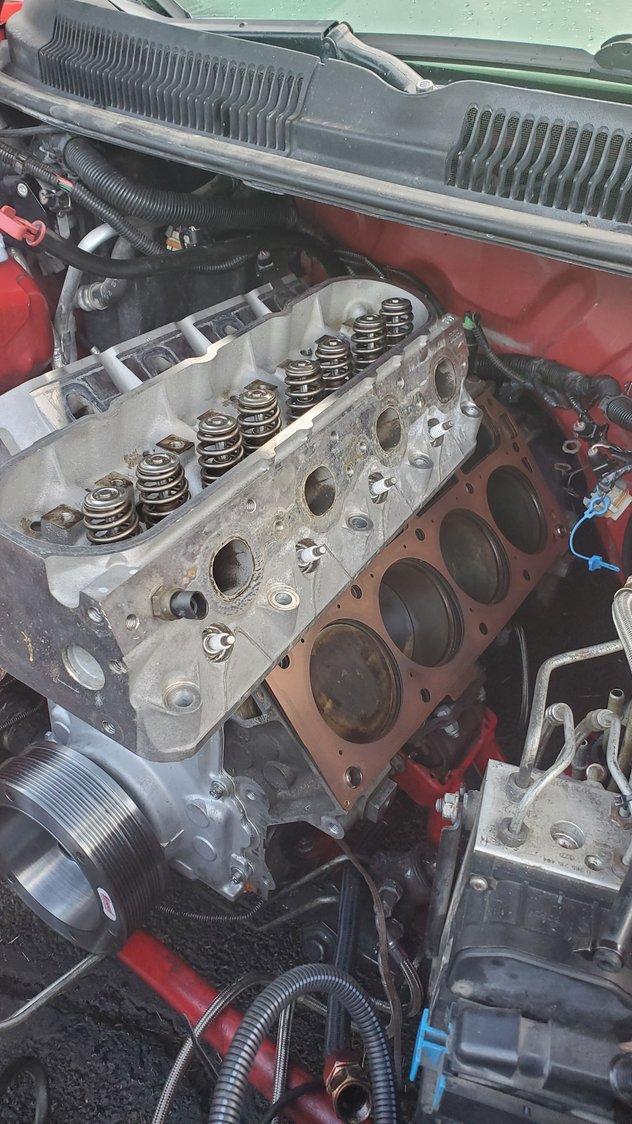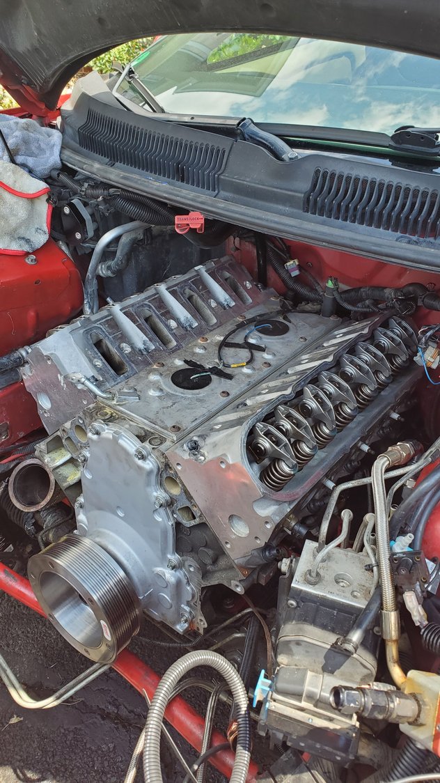 some fresh TR6 gapped at .025 Preparing for the newer 241 heads to go on. ls9 gaskets copper sprayed and laid on the heads. chased all the threads one ladt time to make sure nothing found its way in there. put my exhausr pipe backnin place as well. getting the head into position to hook up the grounds on the back of the drivers head. Head stubs going in. Thanks LS1tech lol initial hand tight in sequence in preparation for the torqing. Thought i had a 1/2" to 3/8" adaptor for my torque wrench can use the 12point sockets, for the stud nuts, but unfortunately not the case. guess i gotta go get some 1/2" 10mm and 13mm 12point sockets or get a 3/8 torque wrench. pretty close to buttoning up the engine. push rods and rockers are next. pac 1218 were already put on the heads before i installed them. the knock sensors and ls6 valley cover are relatively new compated to the stock ls1 block.