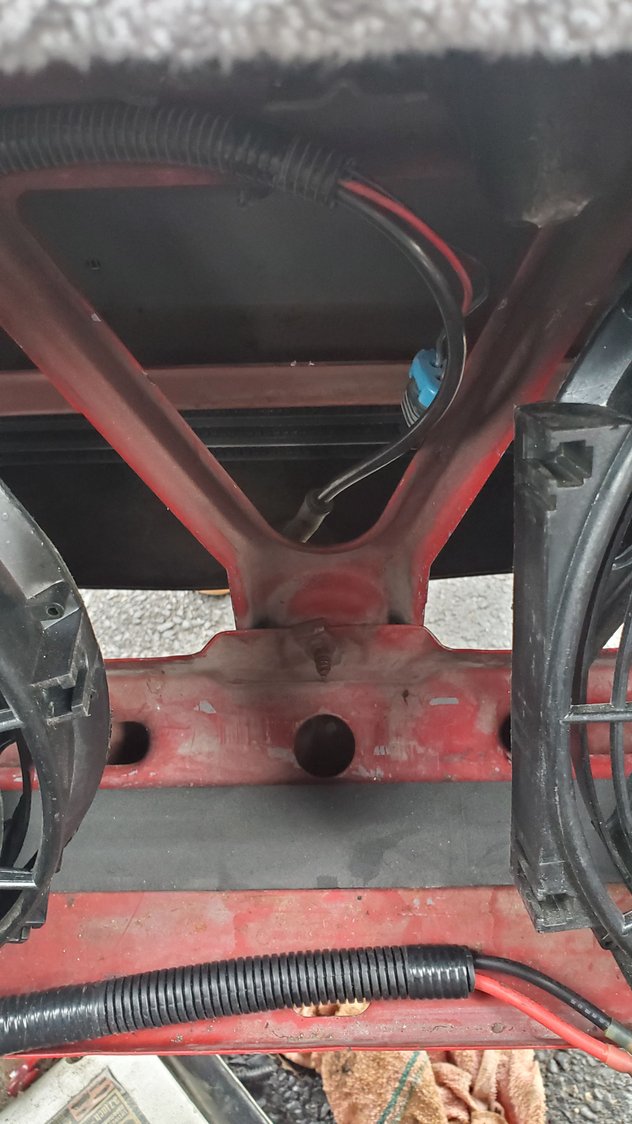 two tiny hole at the bottom. pinched them with needle nose plyers, brake cleaned, and air dried it for now and then dabbed some high heat JB weld and letting cure overnight. this little bastard.... and fixed lol put a rubber air nozzle nipple on it to protect the radiator for round two. also laid that rubber mat down to help keep the rad from sliding around. almost there!!! got the belt back on! also got some 3/8 fuel line hose to finish off the catch cans. think im gonna rewire my fans into pullers since i have rhe room now