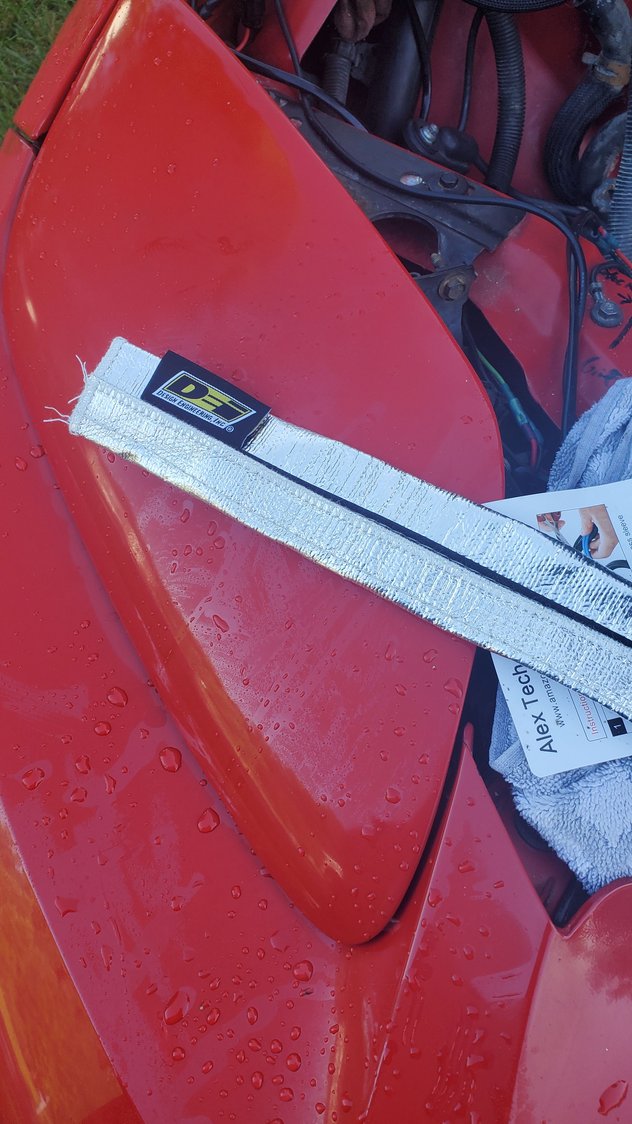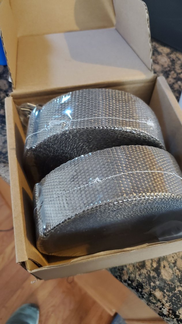 all wrapped up. the last bit on the exhaust was still good so i left that, but everthing from the downpipe up needed to be replaced. if it wasnt covered in coolant it was falling apart anyway. if youre gonna wrap headers or turbo hot pipes, just g9 for the lavarock/titaniim stuff first. fiberglass just doesnt last. not the dei brand, but same concept