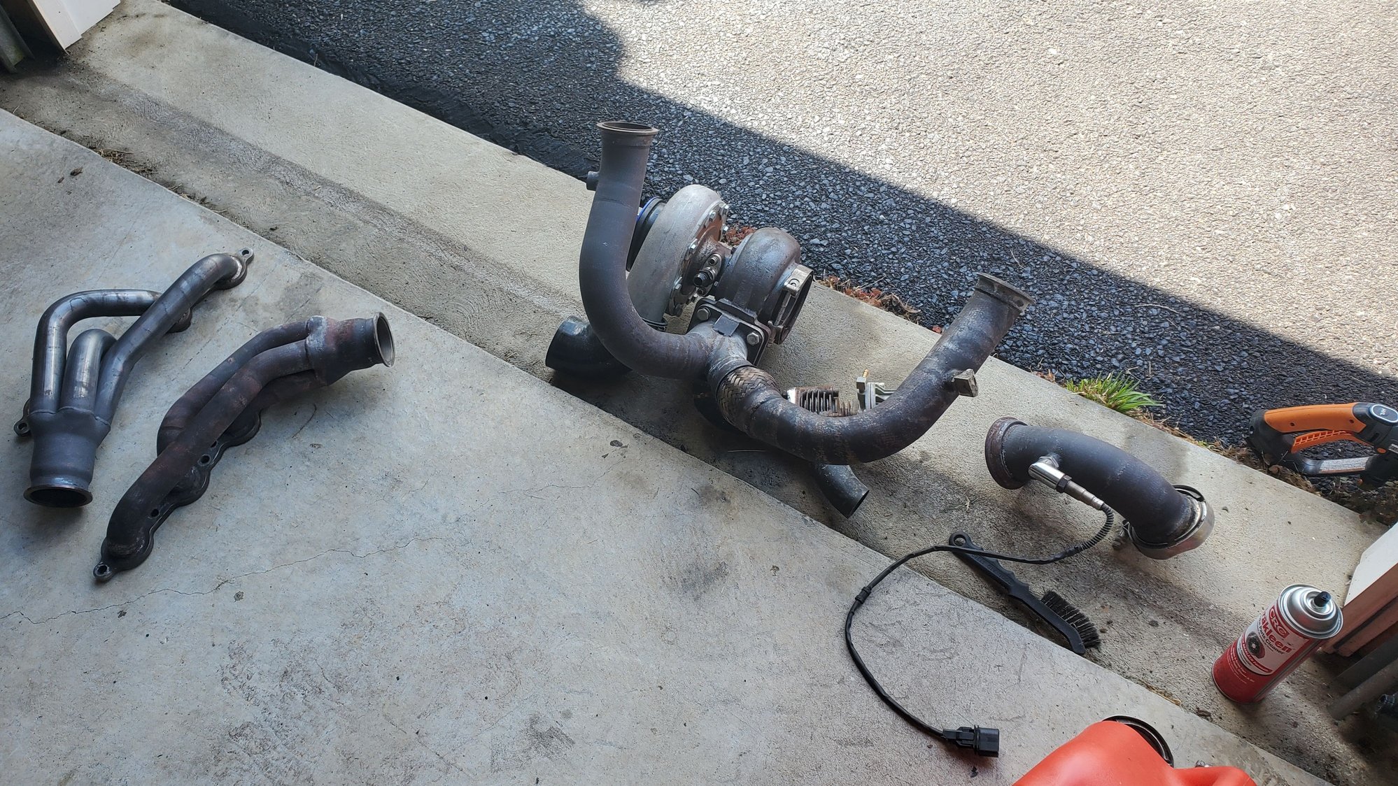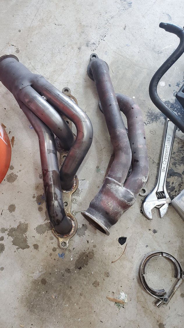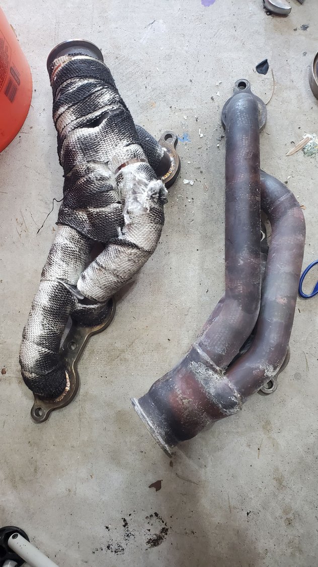 While I'm waiting, I'm in the unfortunate process of unwrapping the old fiberglass wrap and rewrapping with titanium wrap, which isn't any easier lol finally got my newer style thermostat and housing. learn something everyday lol old pump. pretty sure the bearings are on their way out lol the bird waiting for the coming excitment old wrap coming off. pretty much falls apart. god i hate fiberglass right where it belongs lol one side seems to have been hotter than the other, or the wrap was just better on one than the other was gonna swap the gt45 for 7875, but I need a bigger flange welded on the down pipe, so ill save it for when i build the lq4 thats hanging out in the garage.
