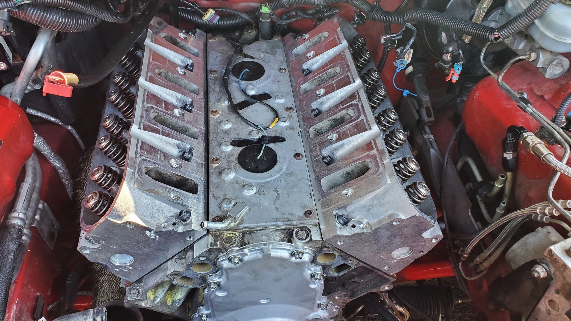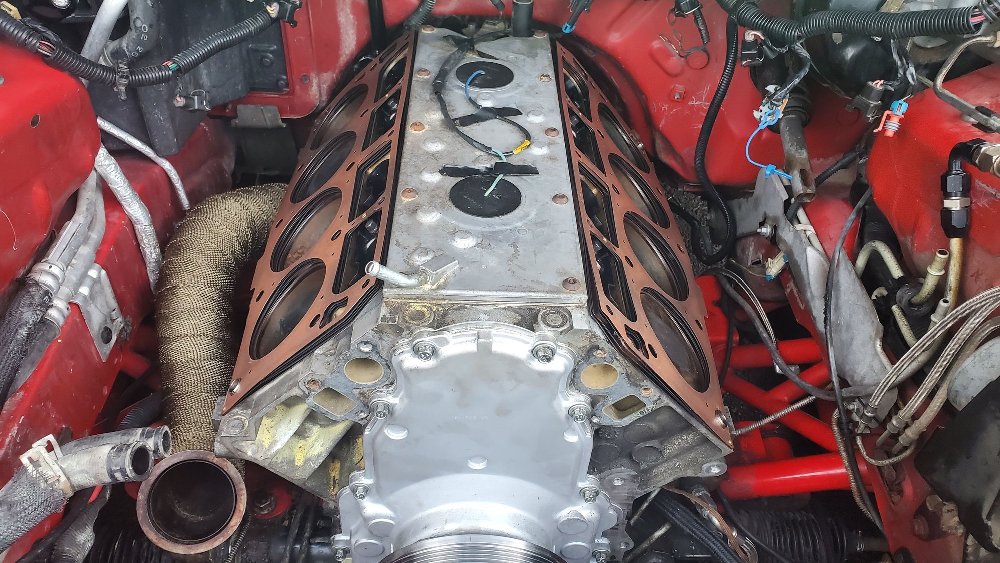 its beginning to resemble an engine again lol rockers being prepped to go on torqed to 22ftlbs. the rockers have the trunion bearing upgrade rockers are all bolted down manifolds gettig back in stuffed in. manifolds all bolted back in. they dont look to bad with the dei wrap waterpump , with some new hardware added. valve covers bolted back