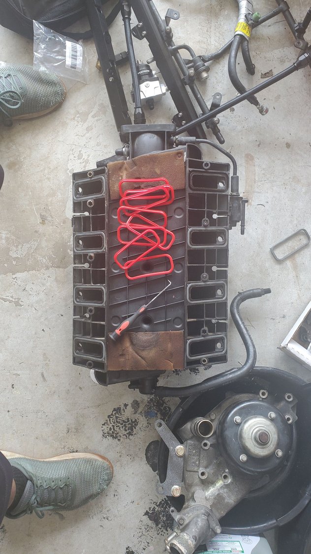Prepped the manifold to go in. little hoses on the bolts to aid in slipping it under the cowl. I think I found a source of a vacuum leak on the back of manifold, an old cap was split. fixed that and zip stripped the sensor cuase it just doesn't seem very secure.