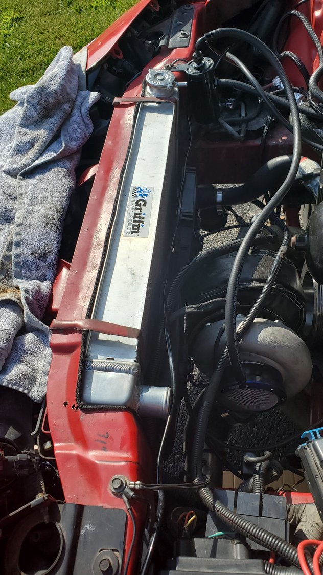waiting in 2.5" vband cause the one that came with the kit sucks.. and then while test fitting the girffin radiator see if i had room fornsome stuff, i nipped one of the rows with one of the bottom screws in the front bumper support. just enough to staet leaking 😮💨 so ill need a repair
